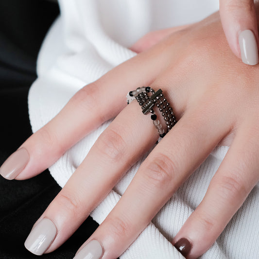 宇宙冰晶 胭紅薄霧 冰晶黑尖晶雙圈珠鍊戒指-厚鍍黑金