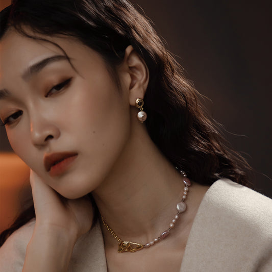 太陽閃焰 太陽黑子金運石垂墜珍珠耳環-厚鍍18K金 (L)