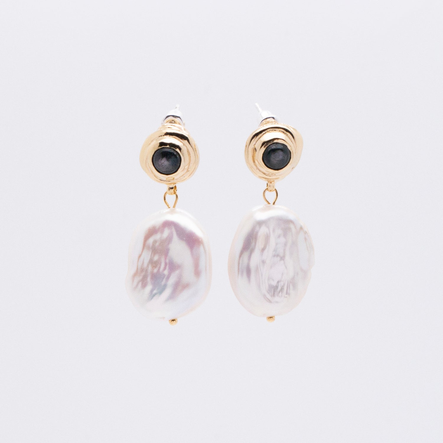 太陽閃焰 太陽黑子黑瑪瑙垂墜白珍珠耳環-純銀 (S)