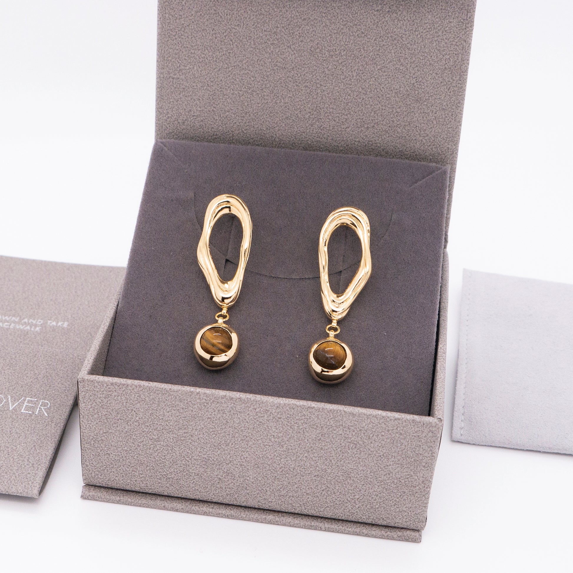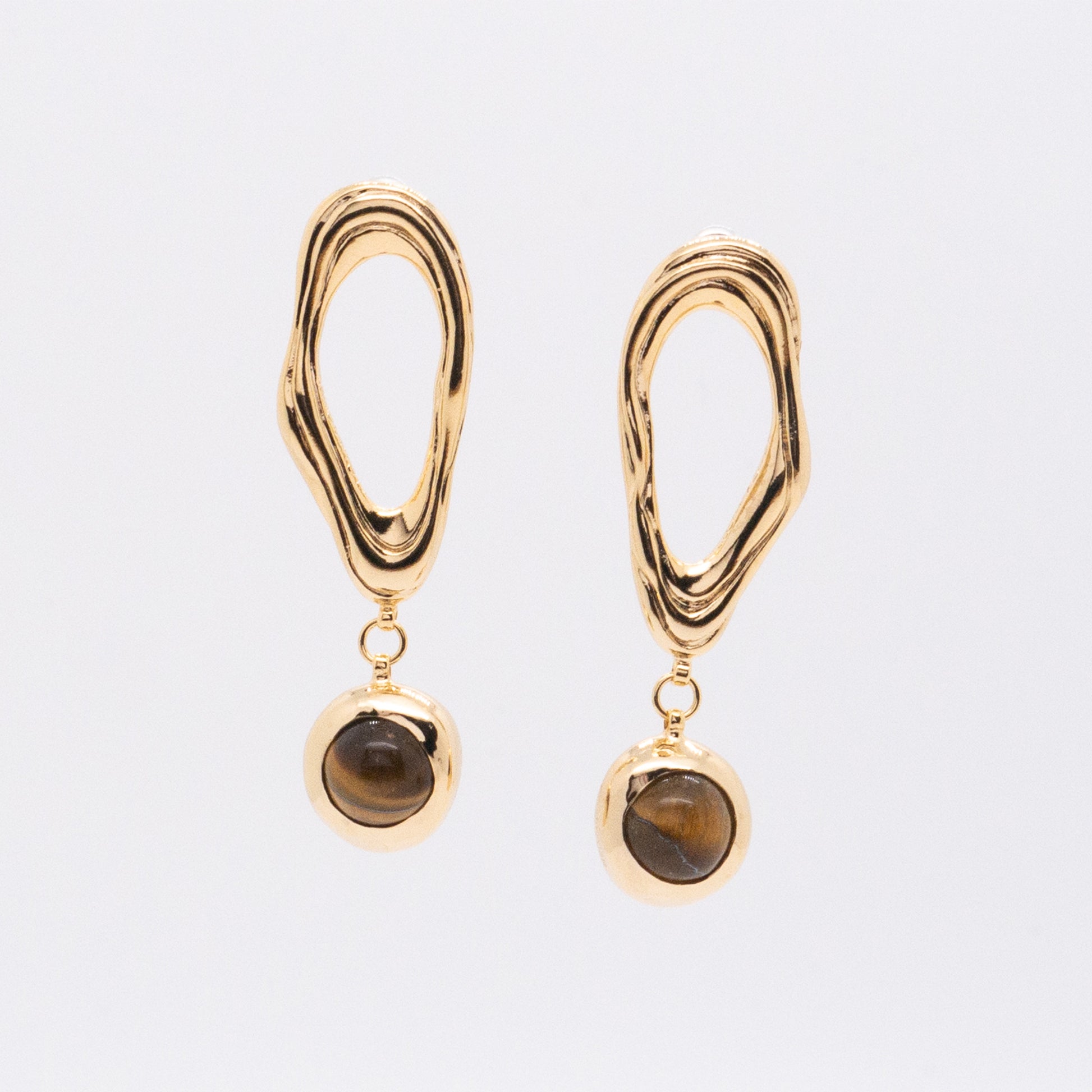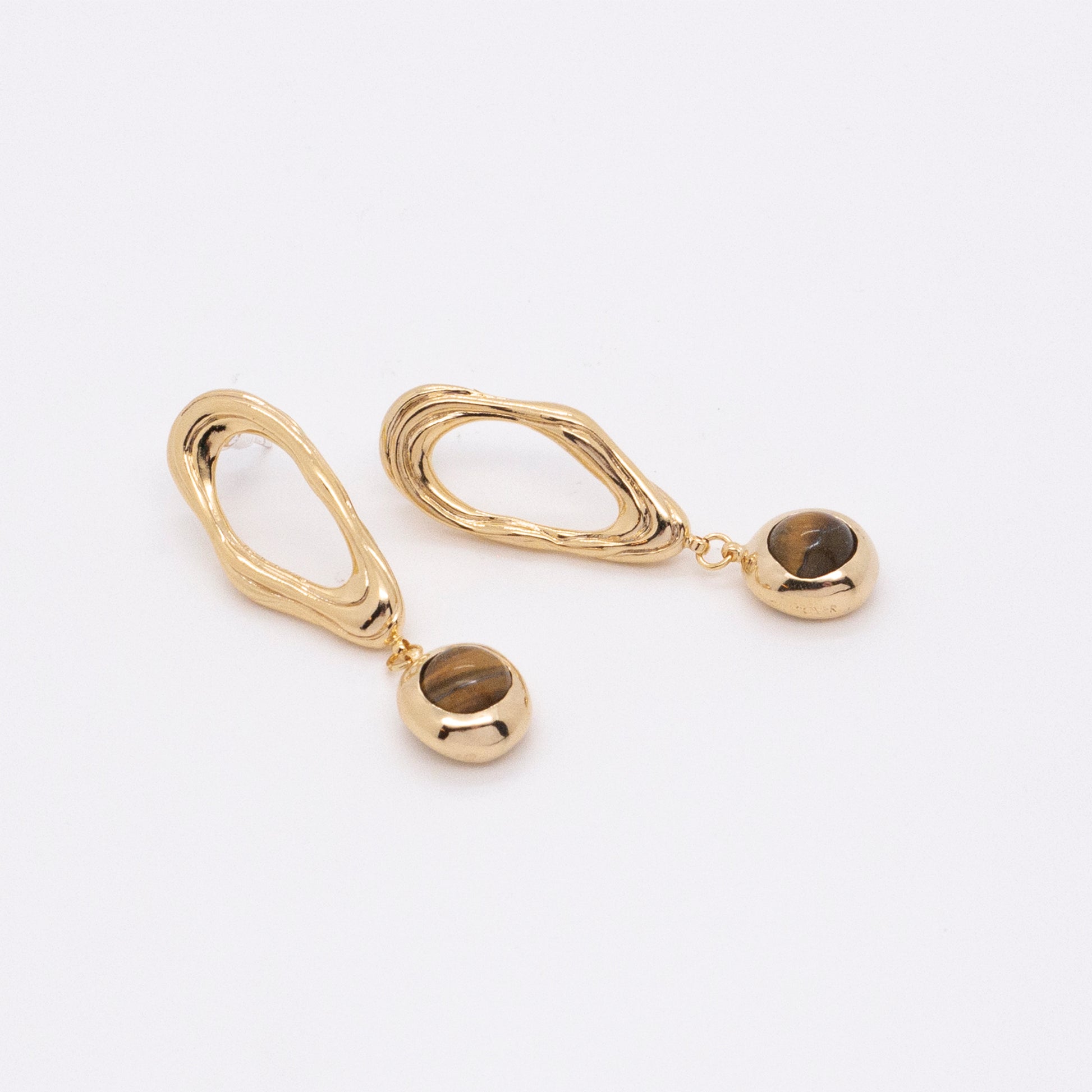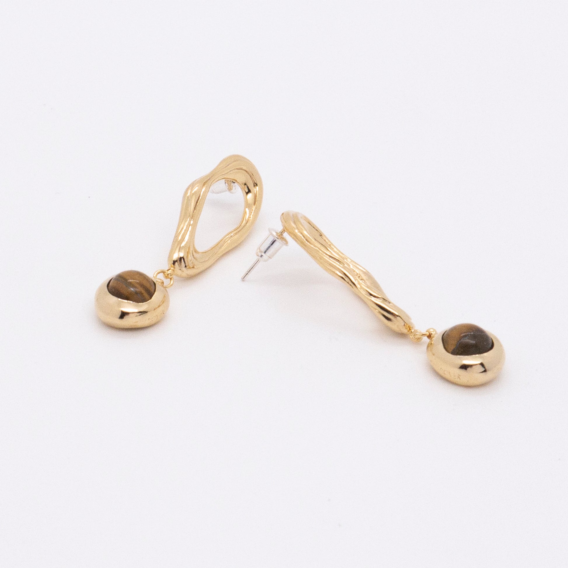 - Material:18K gold plated brass, Silver pins & earring backs, Tigerite