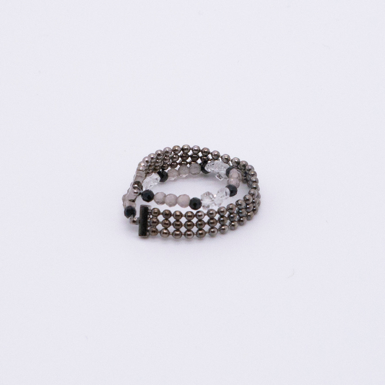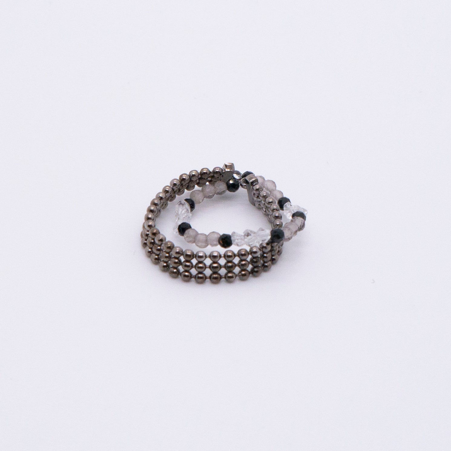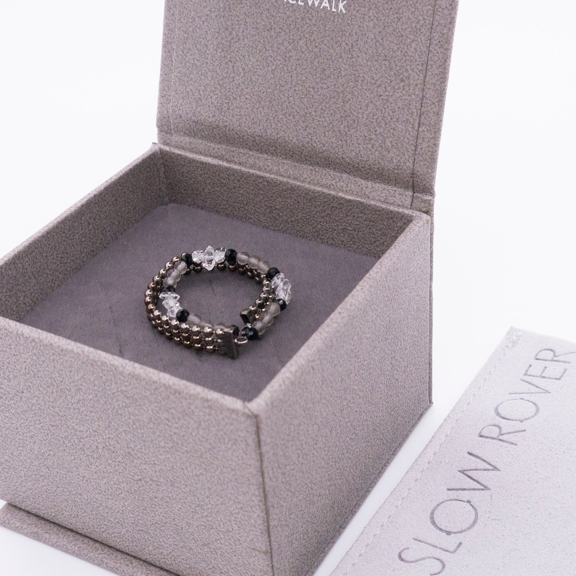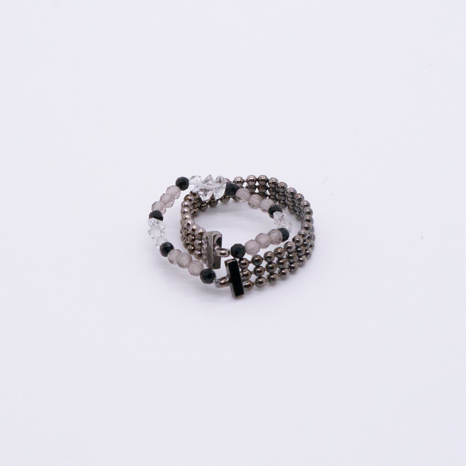 DATE. 09/10/22. Space Ice - Magenta Mist - Herkimer Diamond & Black Spinel Beaded Double Hoop Chain Ring (Black Gold Plated)