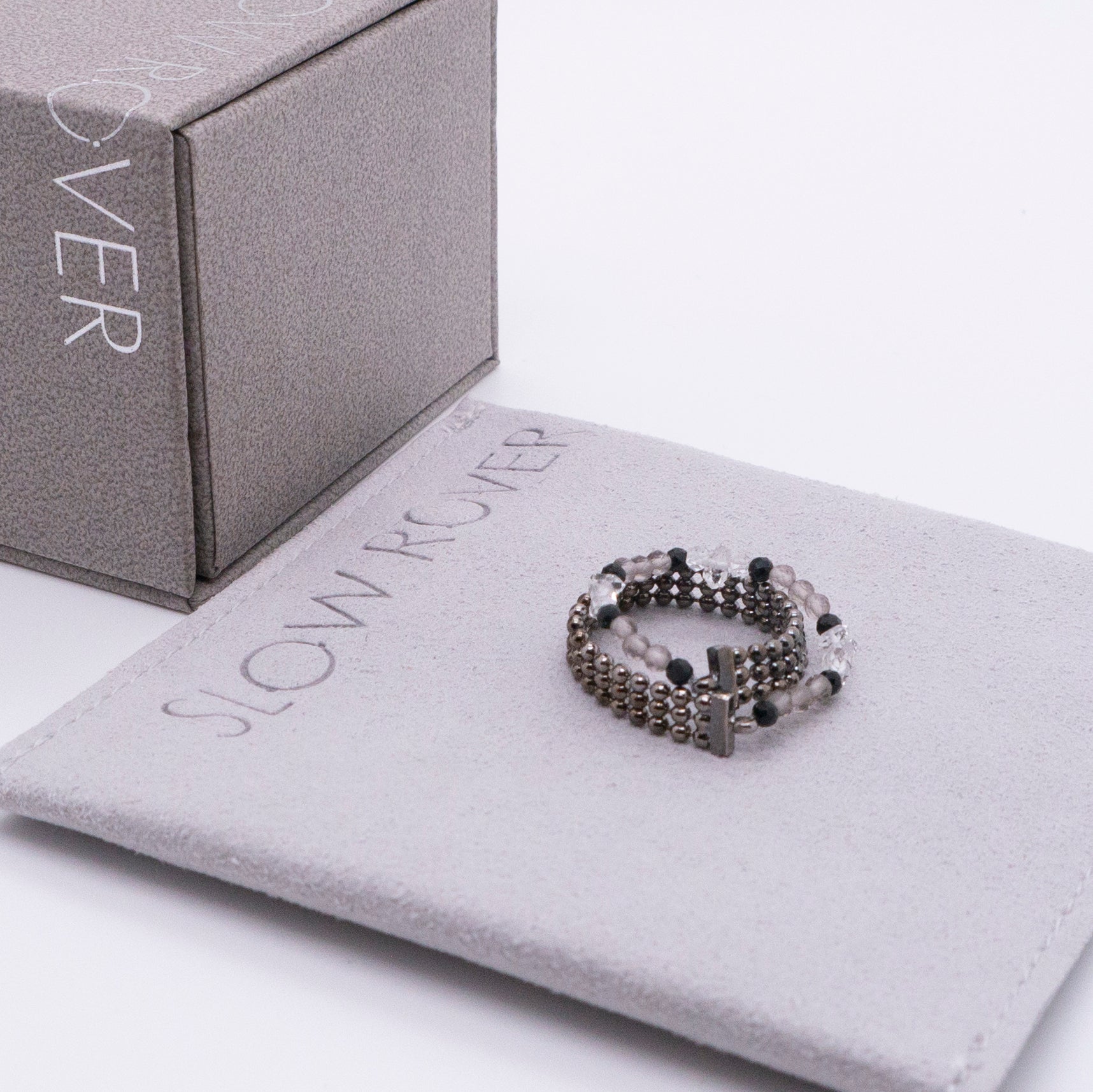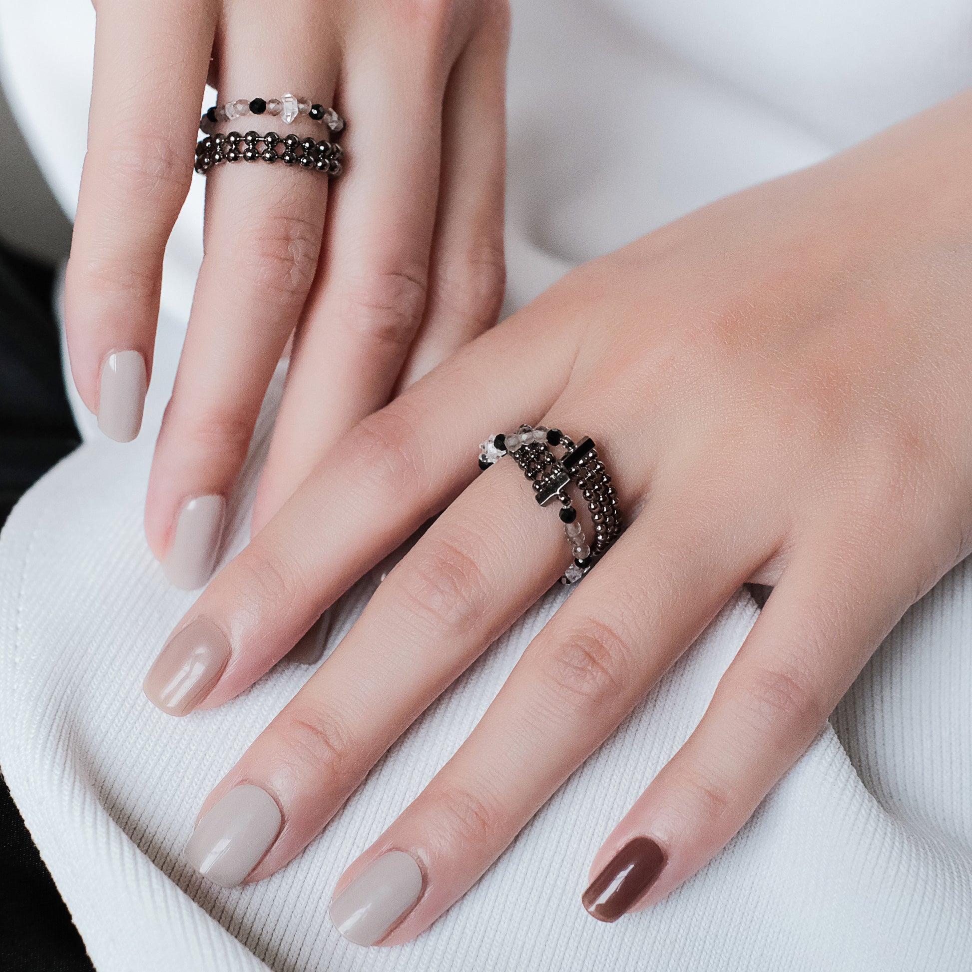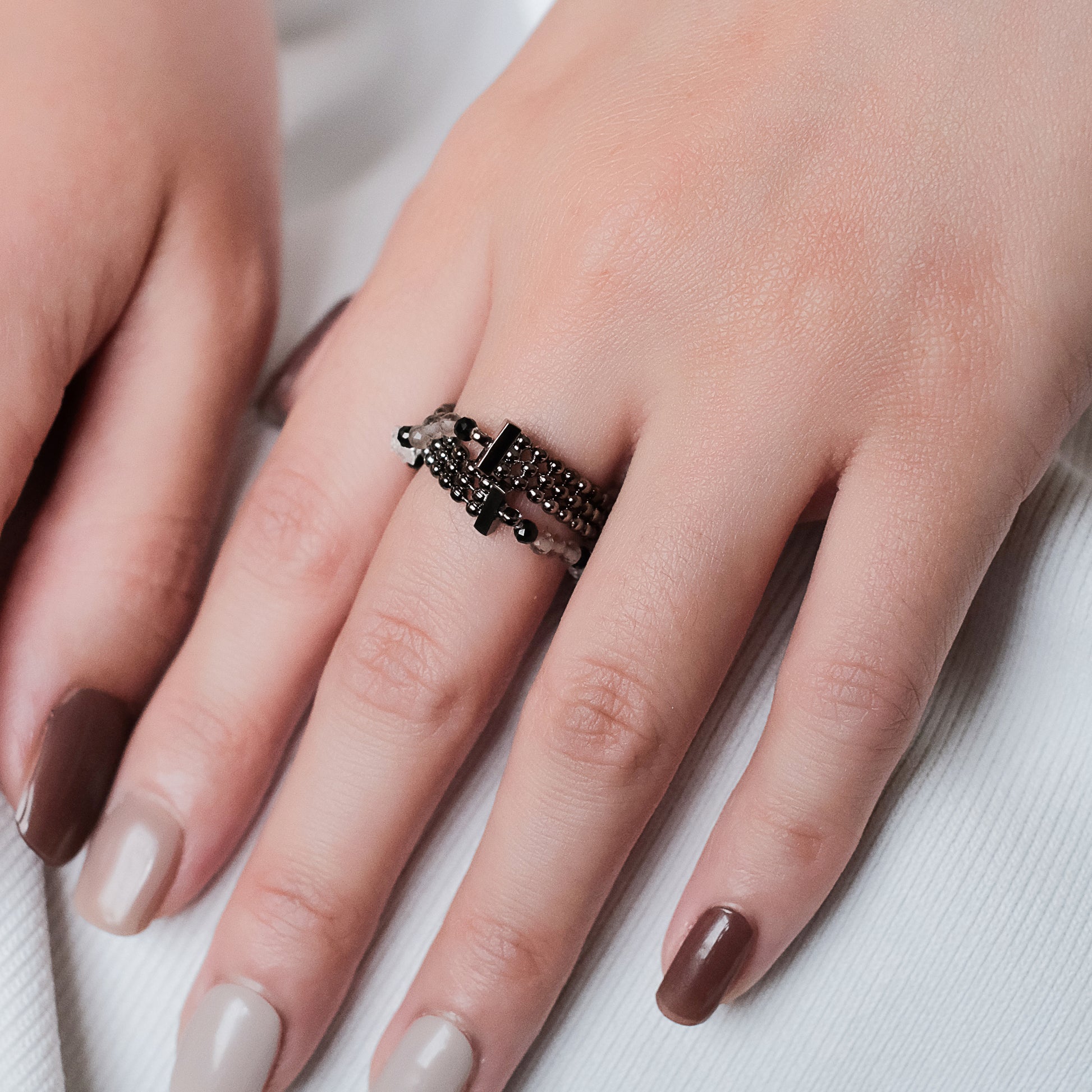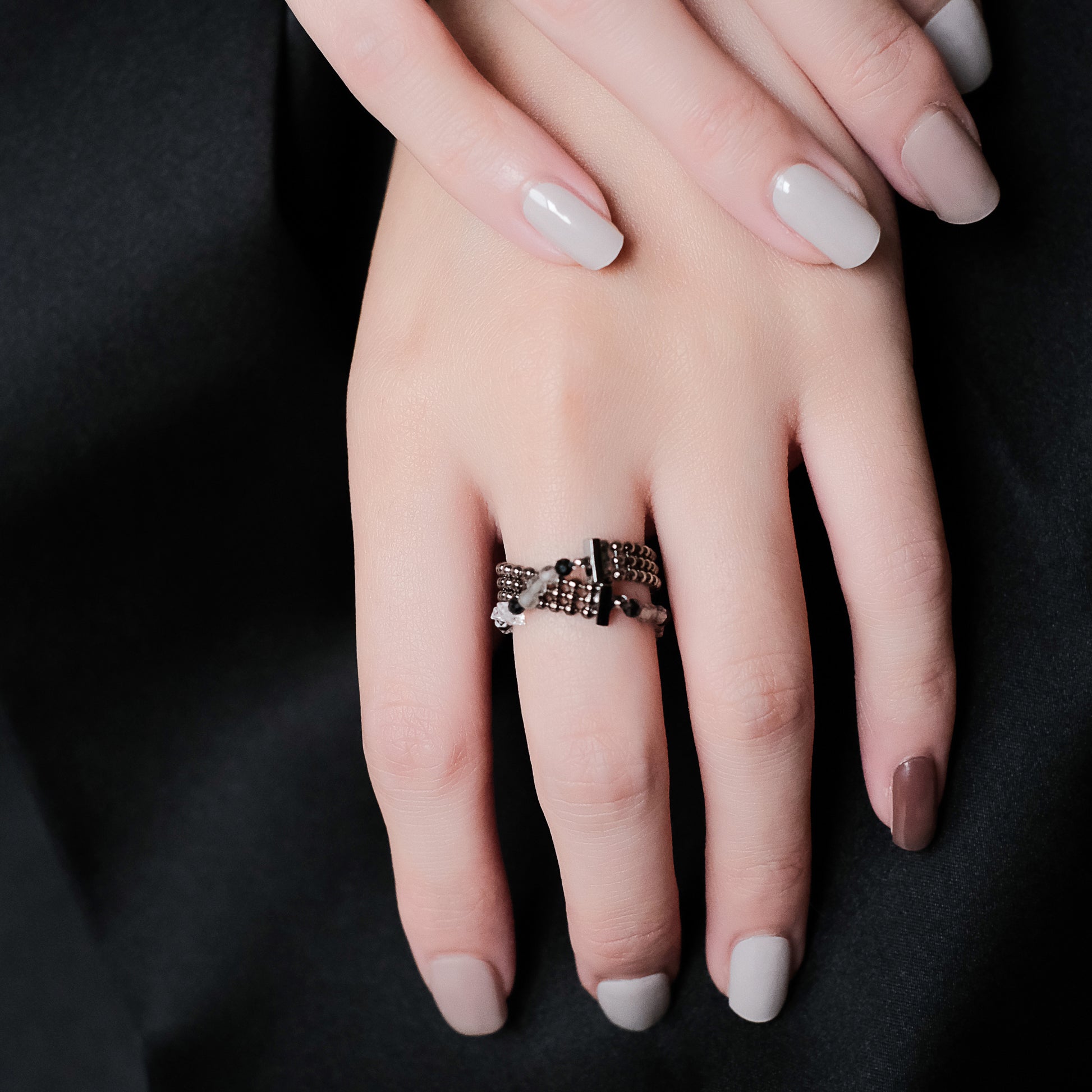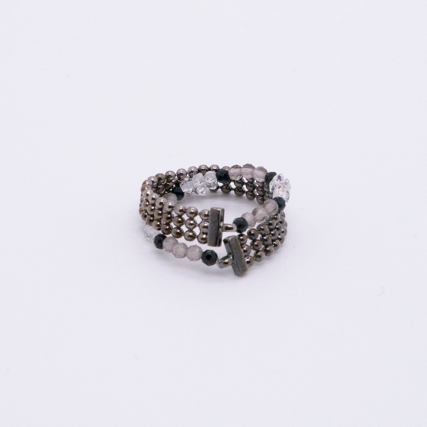 DATE. 09/10/22. Space Ice - Magenta Mist - Herkimer Diamond & Black Spinel Beaded Double Hoop Chain Ring (Black Gold Plated)