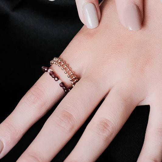 코스믹 아이스 크리스탈 루즈 미스트 아이스 크리스탈 가넷 더블 서클 비드 체인 링 - 두꺼운 로즈 골드 도금