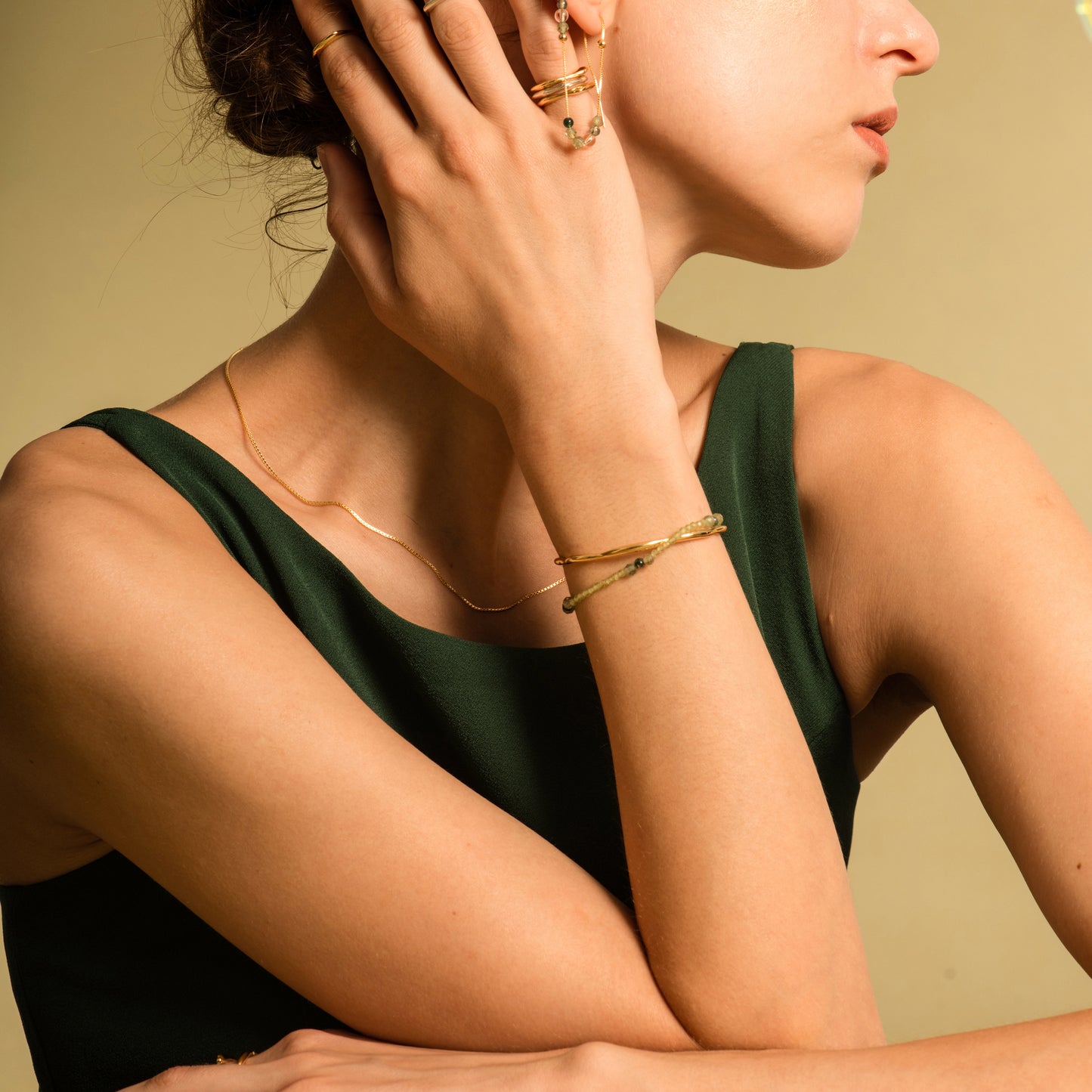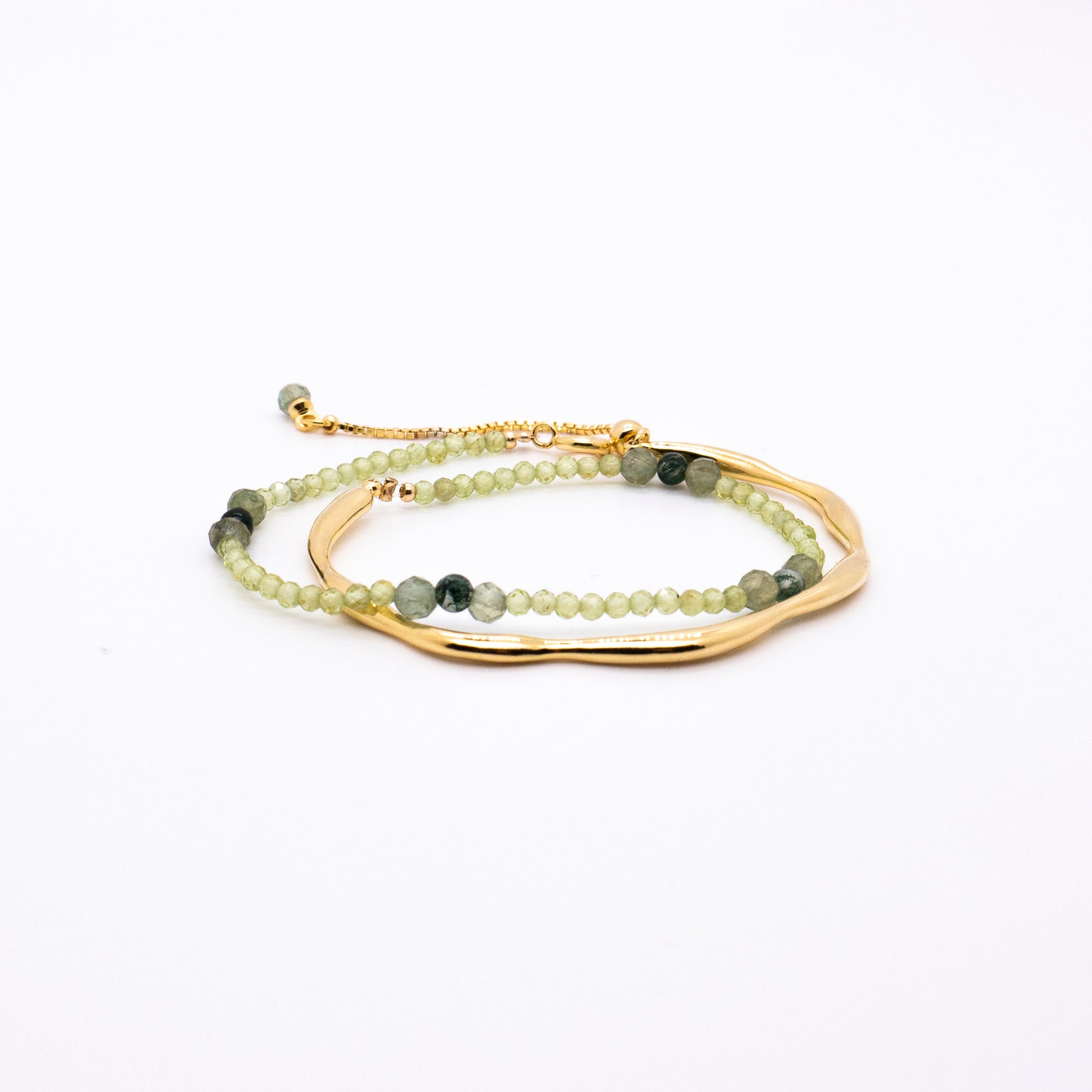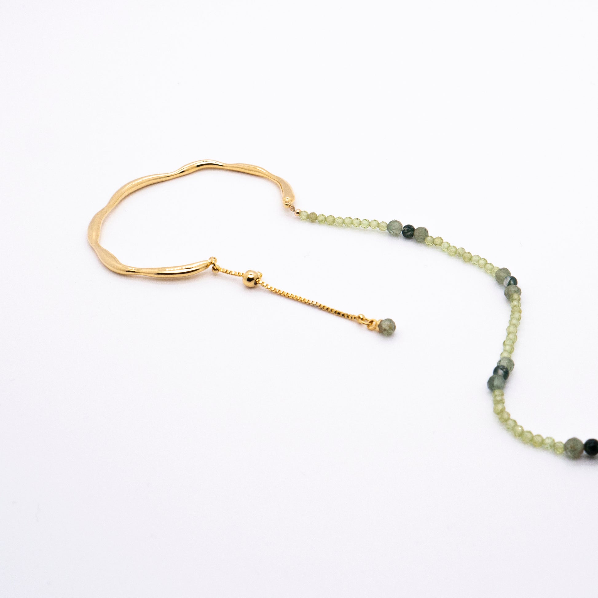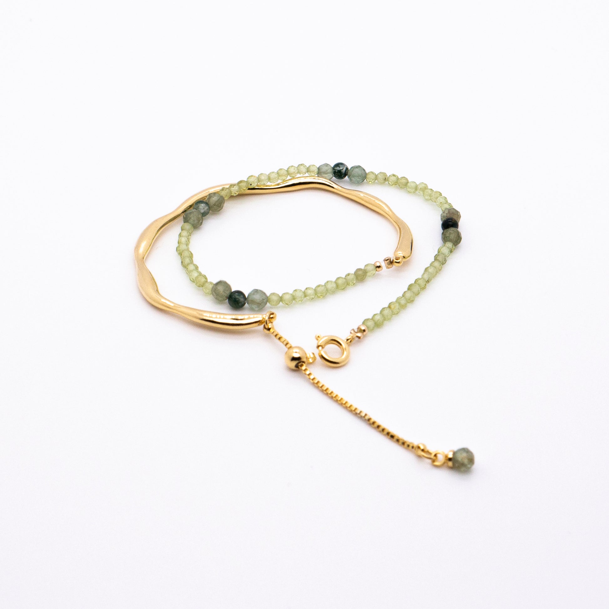 - 材質:黃銅厚鍍14K金、天然橄欖石、水草瑪瑙、綠磷灰石
