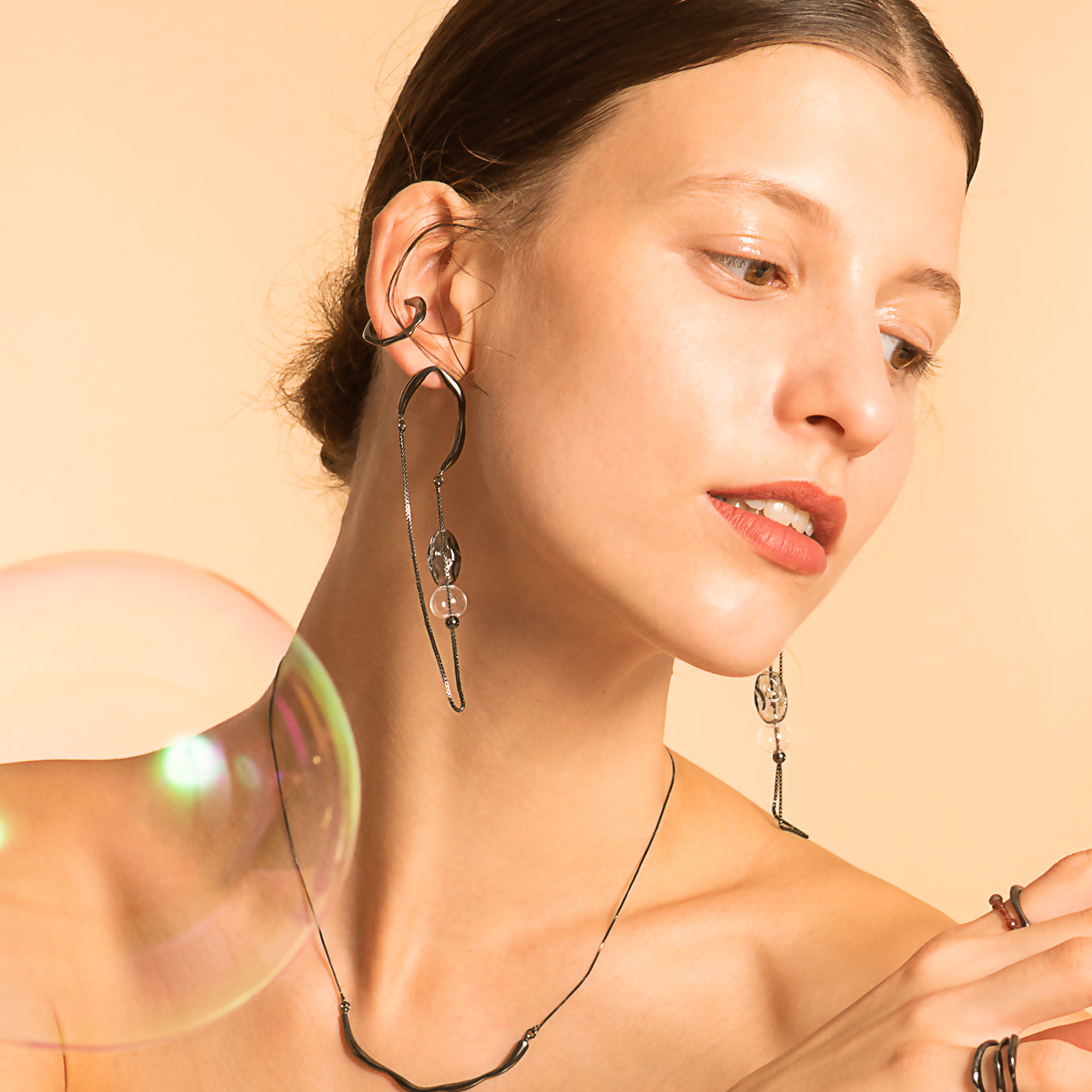 本系列以金屬質感結合天然水晶、半寶石、手工琉璃氣泡描繪這動人的一幕