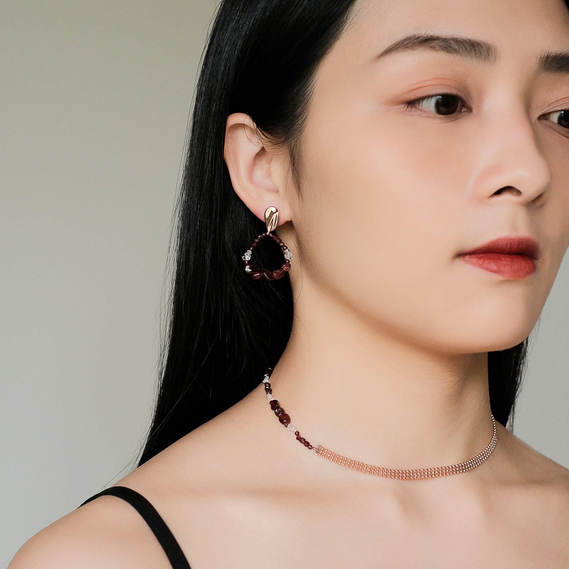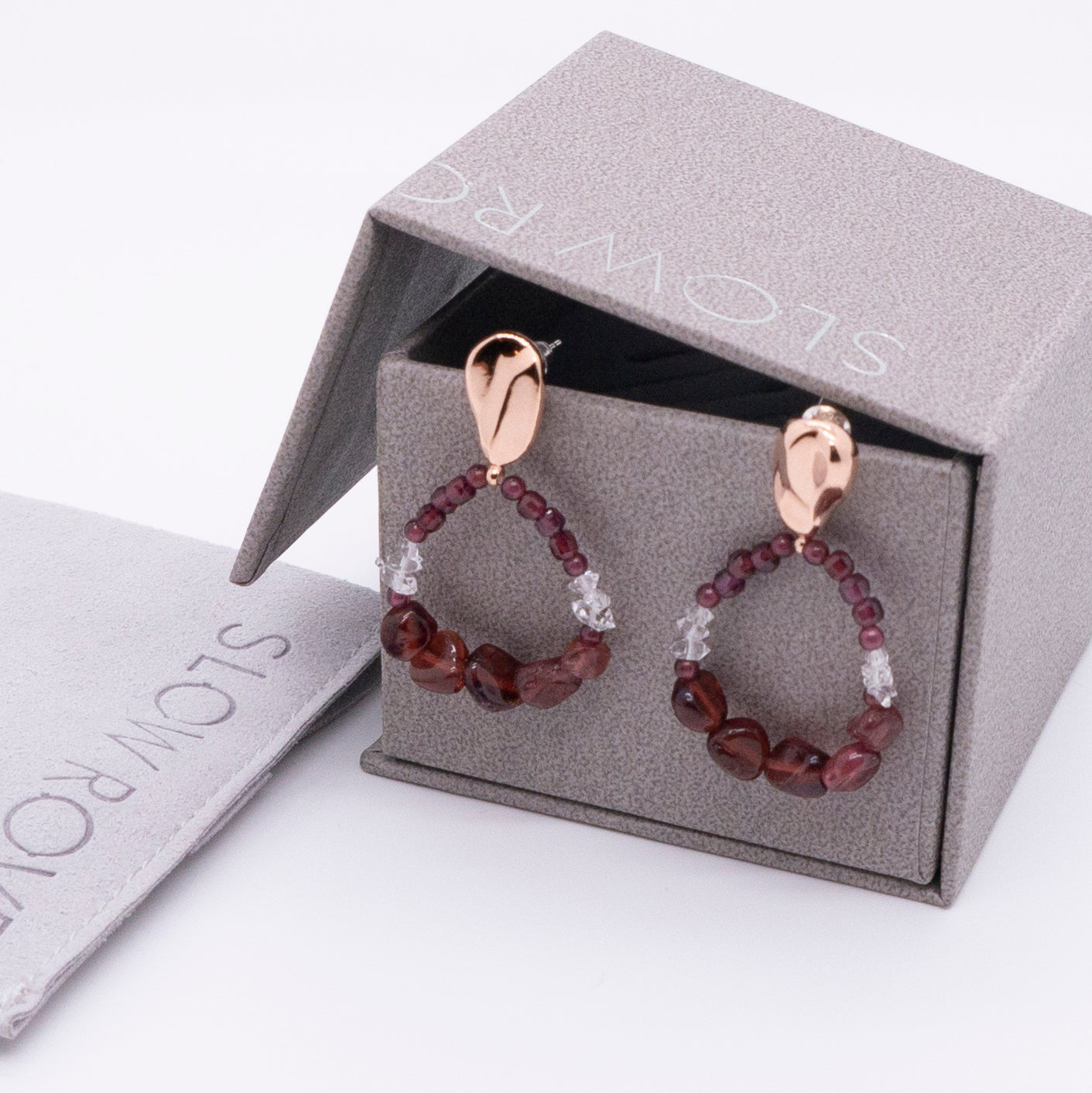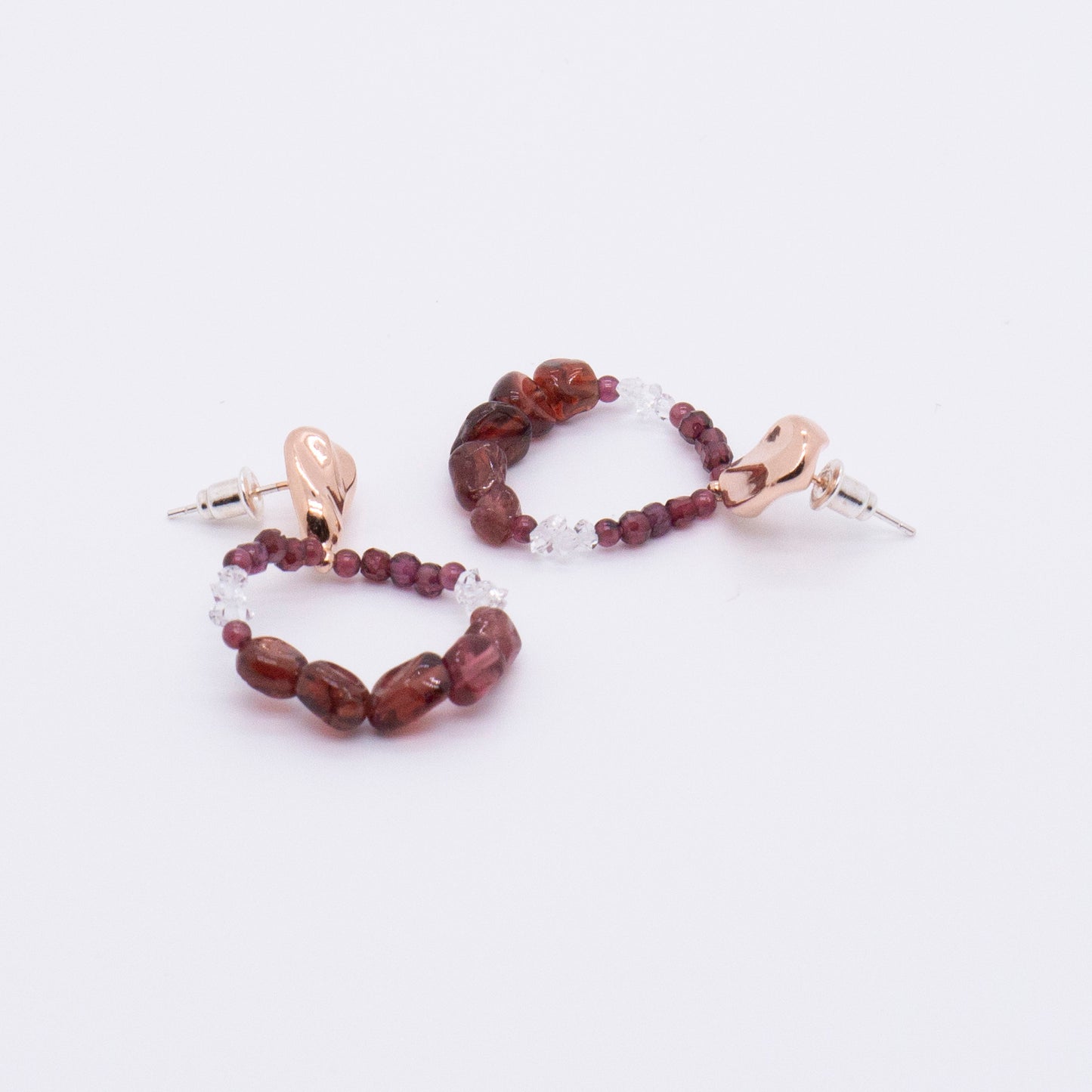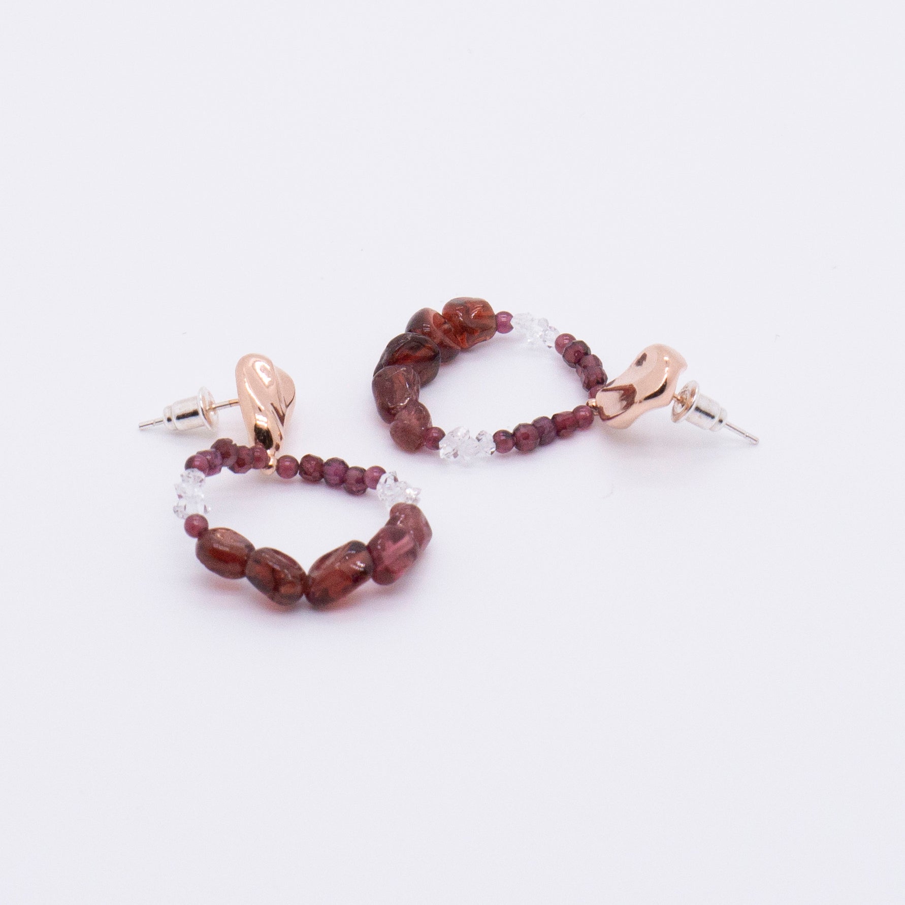 / 商品規格- 材質:黃銅厚鍍玫瑰金、純銀耳針與後扣、閃靈鑽(赫基蒙水晶)、天然石榴石