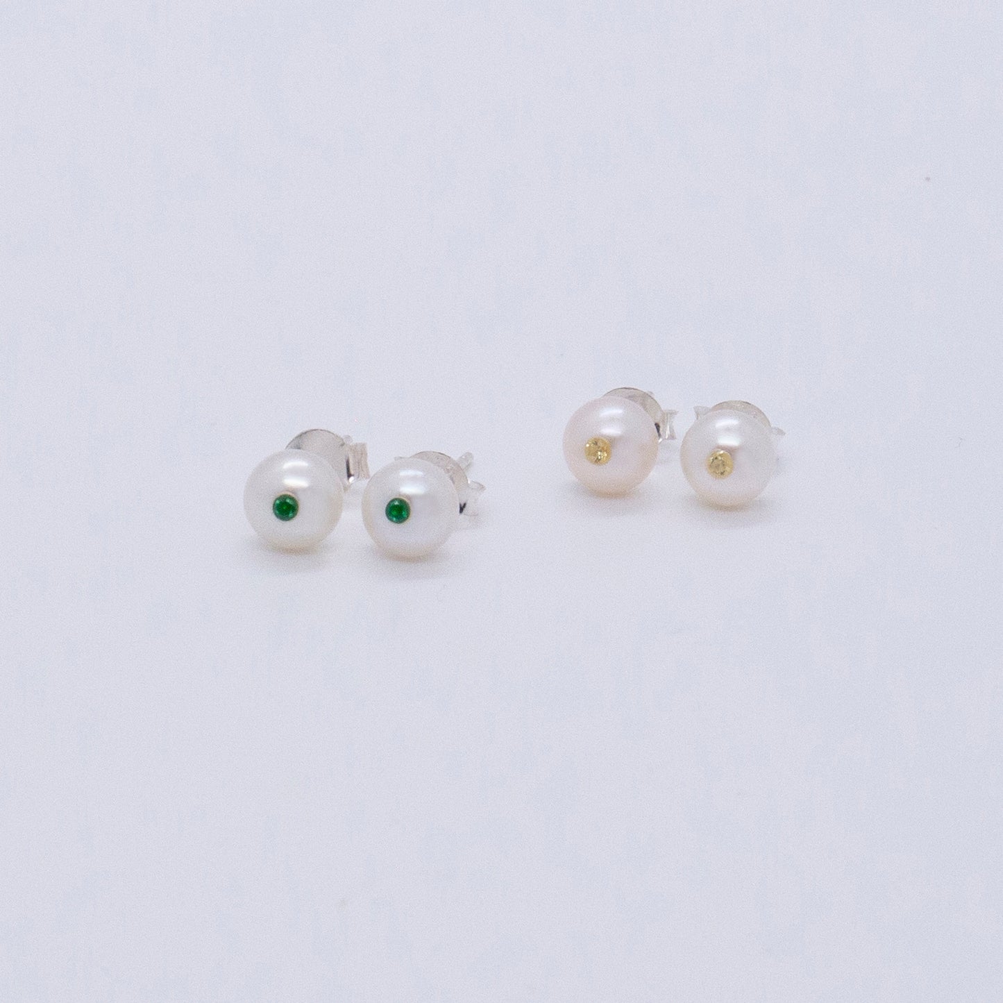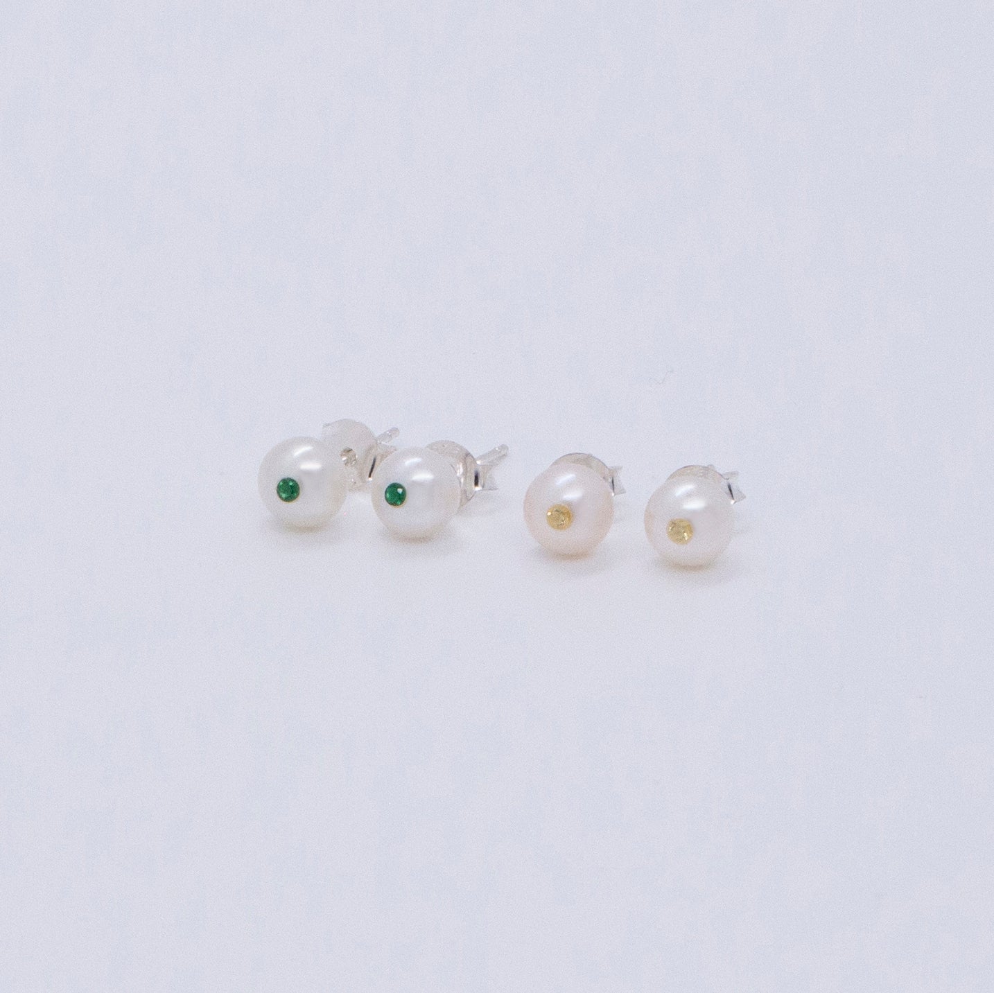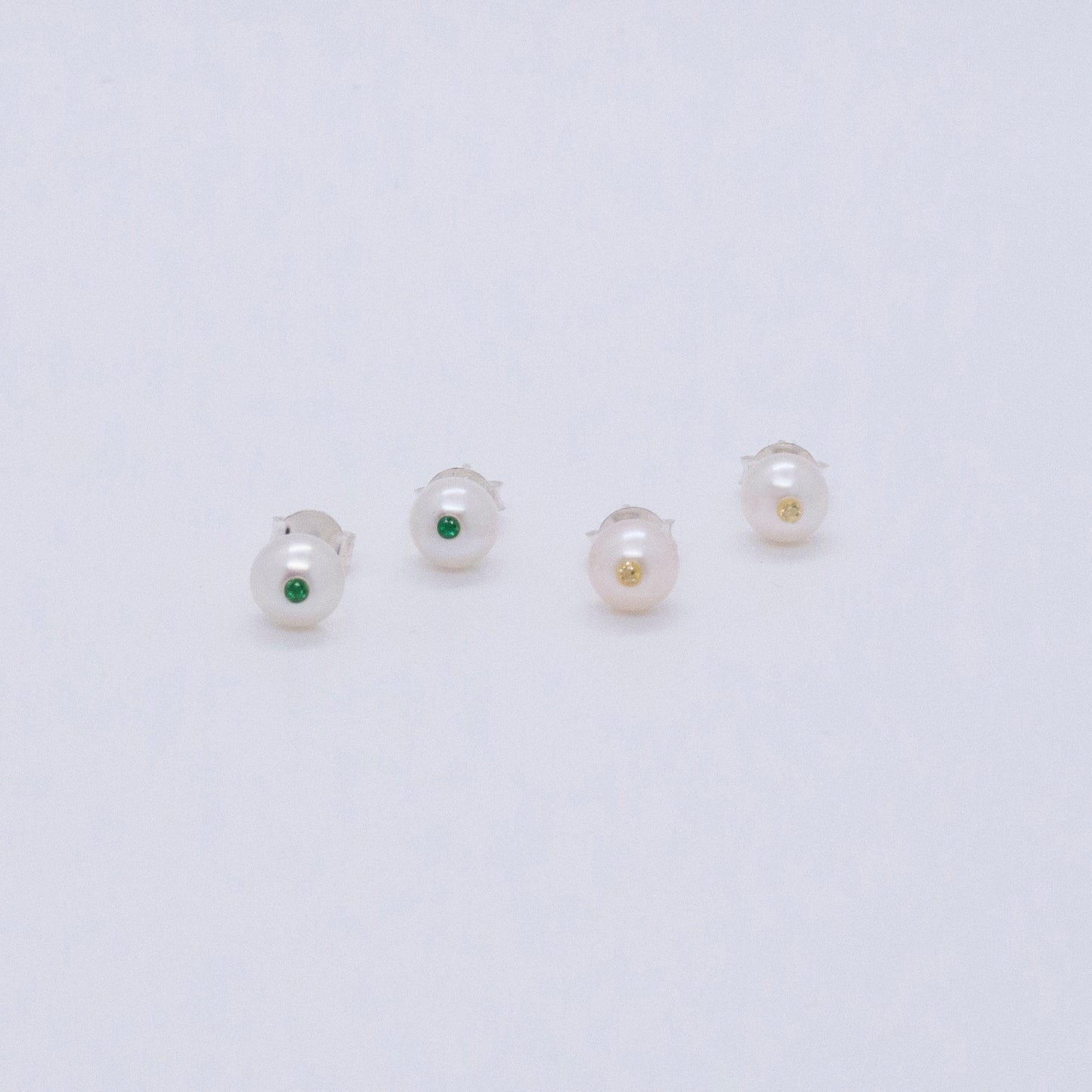 多重宇宙 簡約鋯石5mm白珍珠耳環-祖母綠色