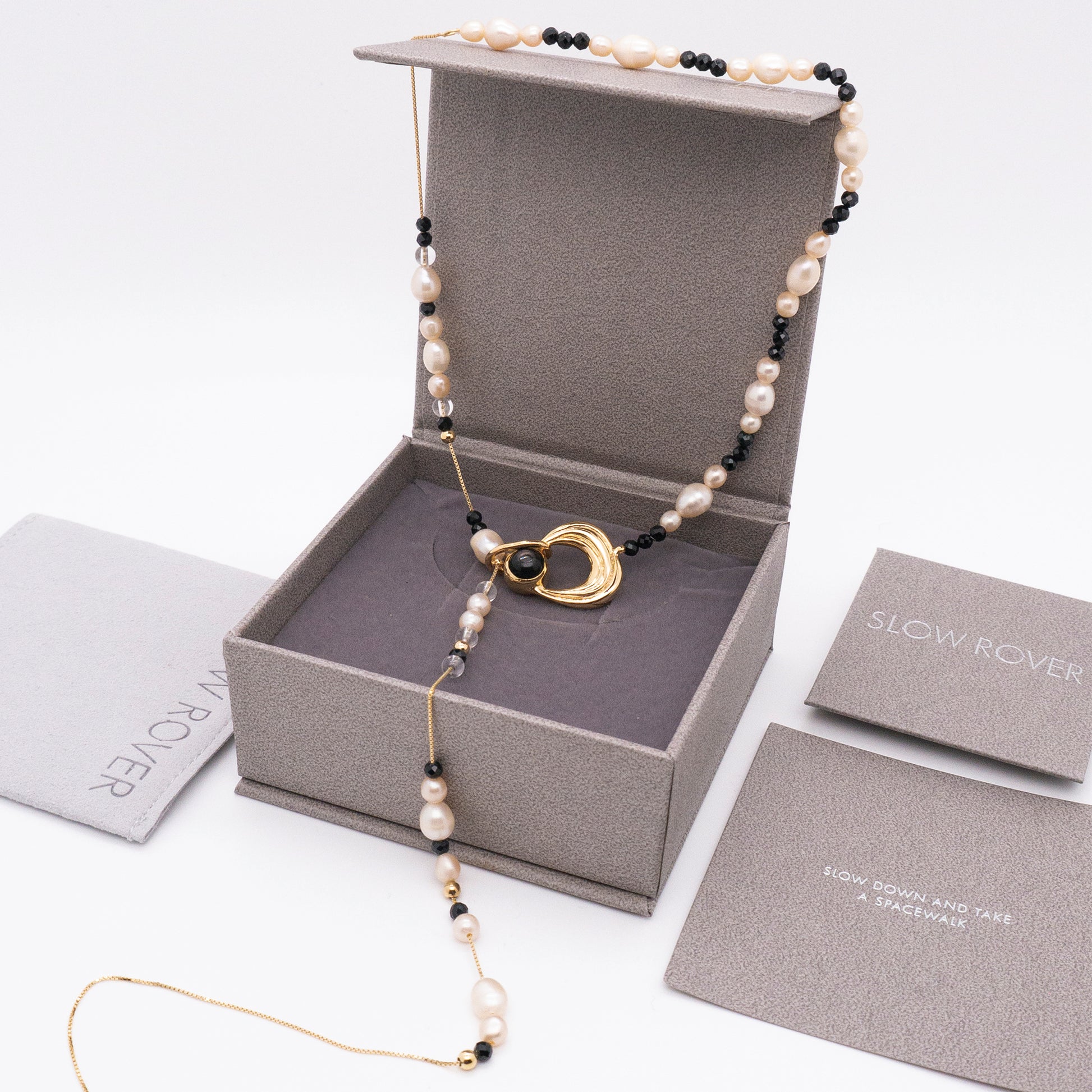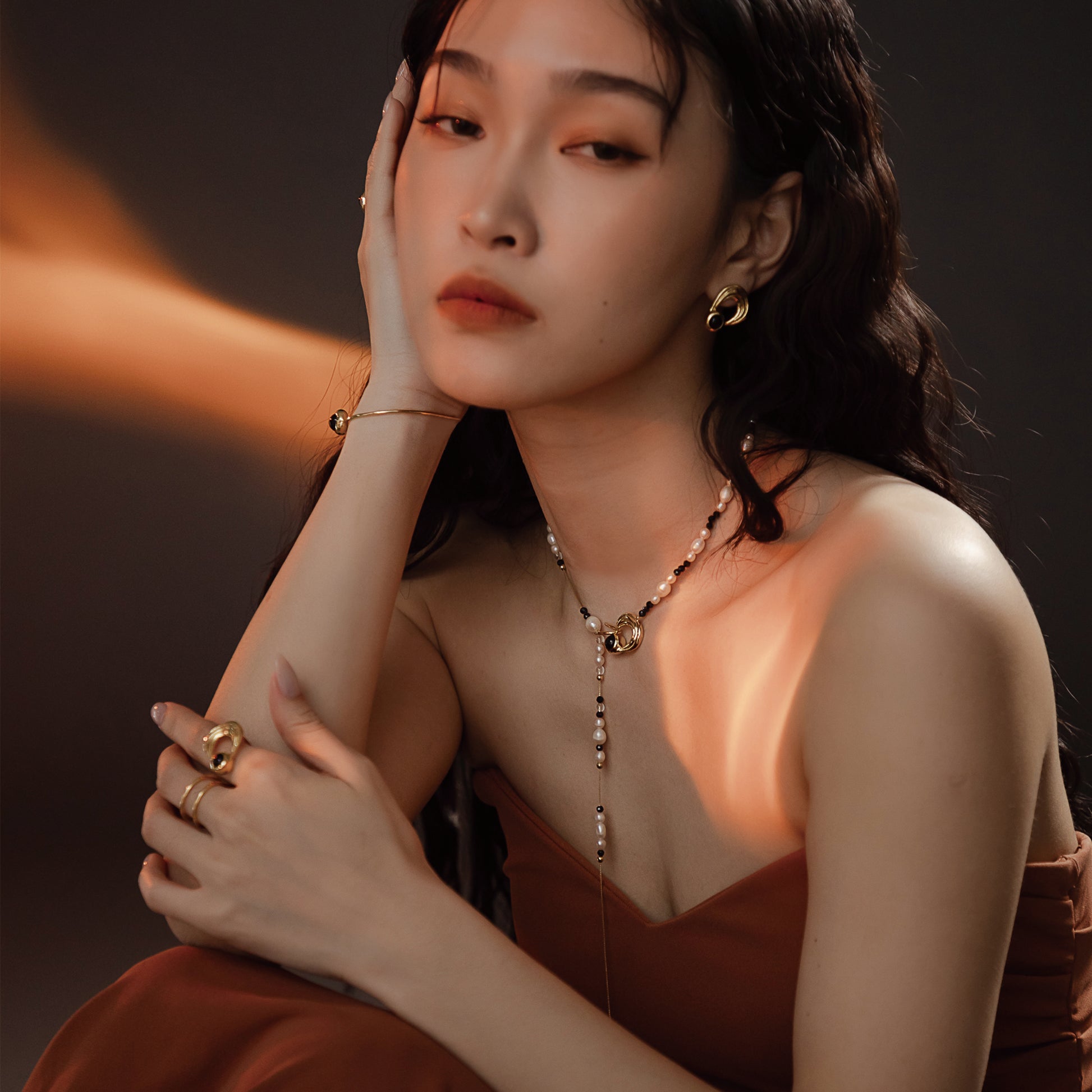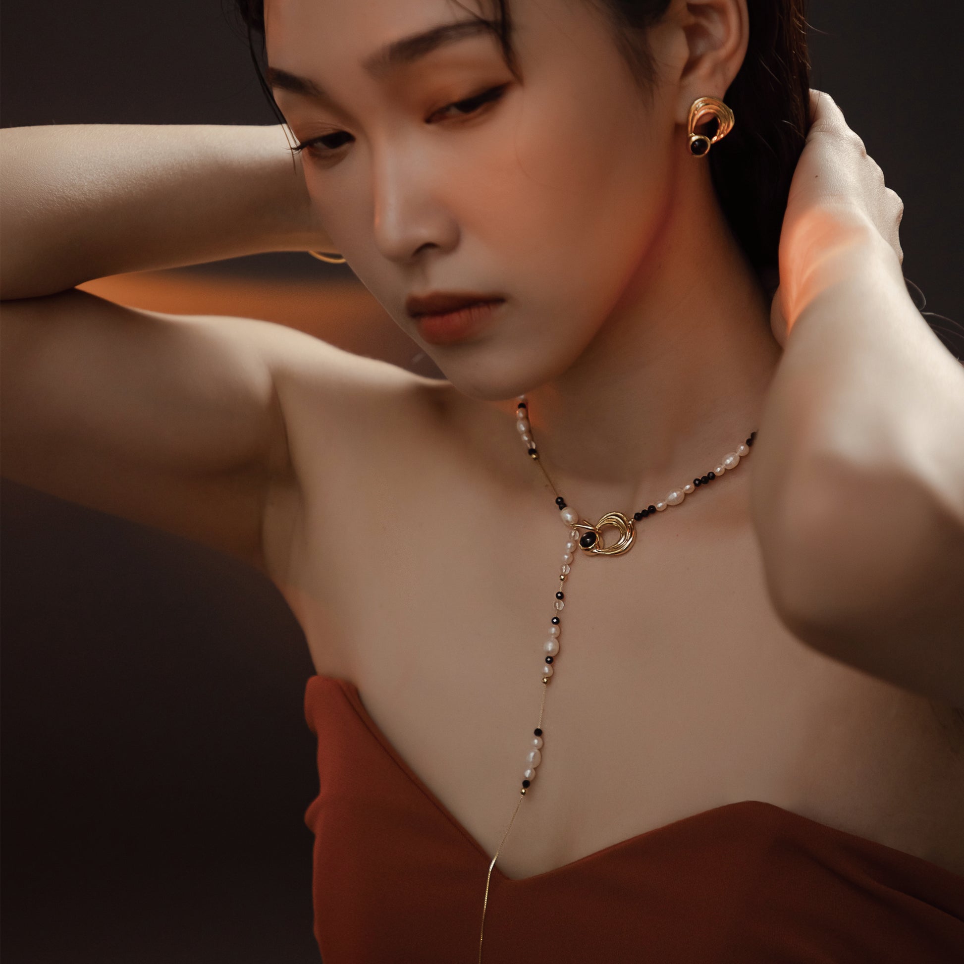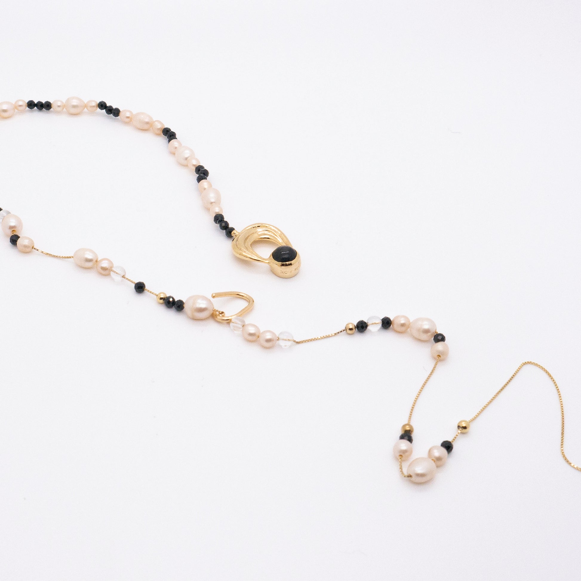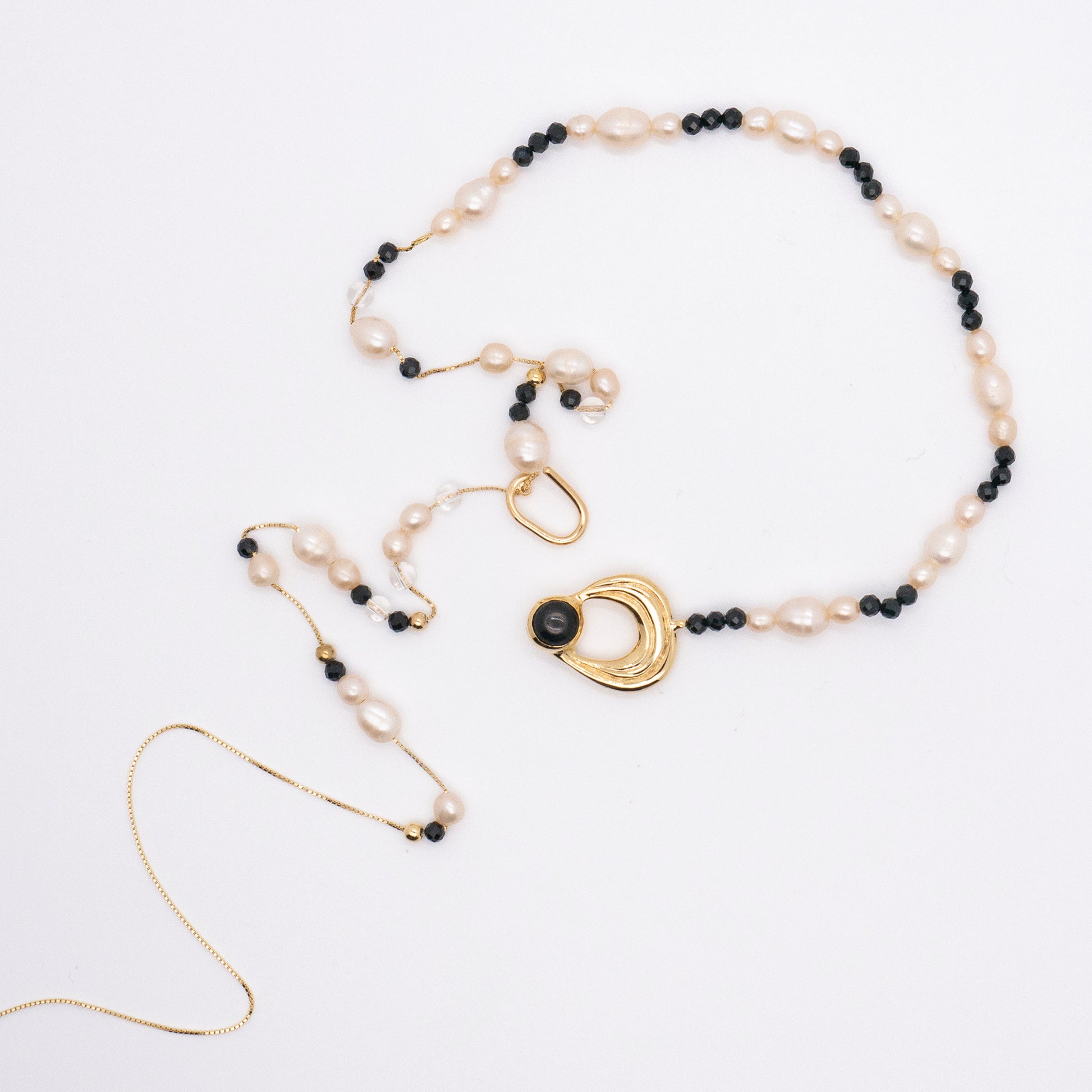 - 材質:純銀鏈厚鍍18K金、黃銅厚鍍18K金、金運石、黑尖晶石、天然淡水珠、白水晶