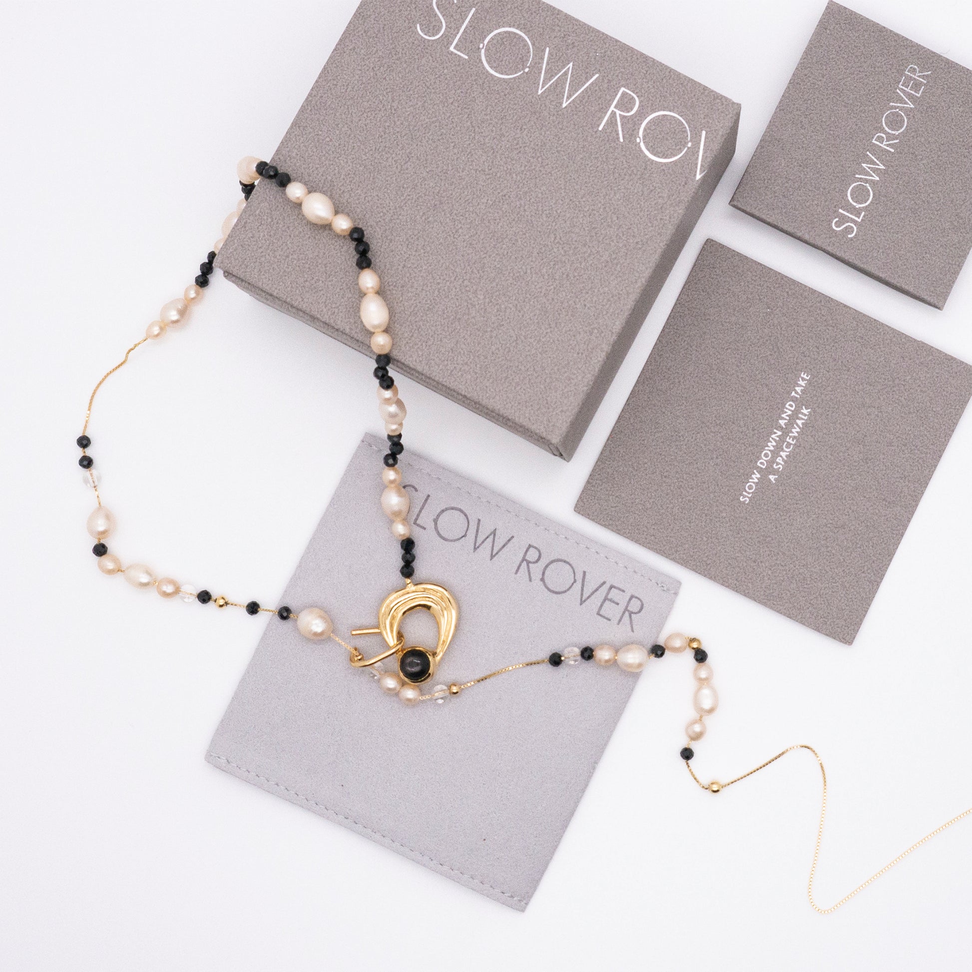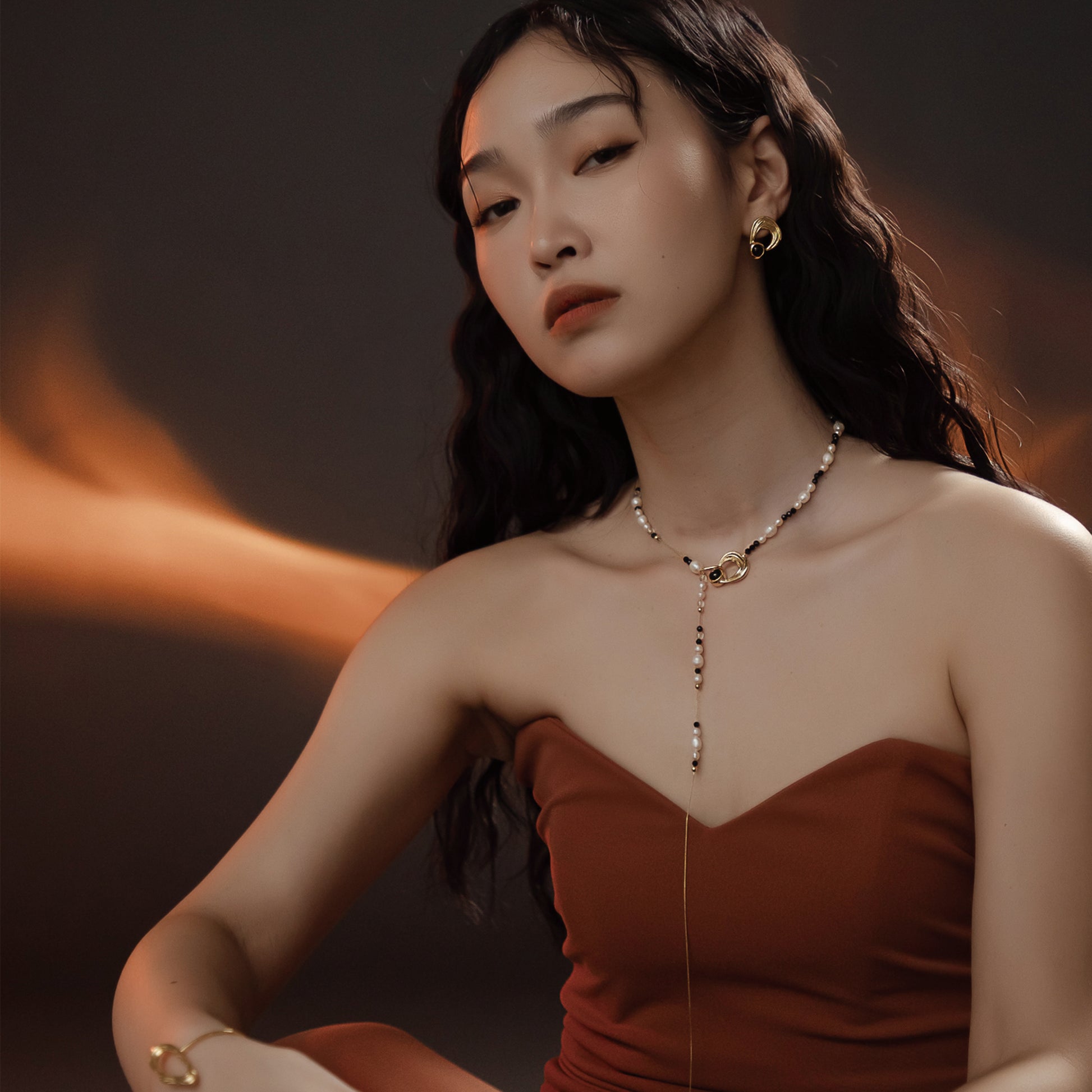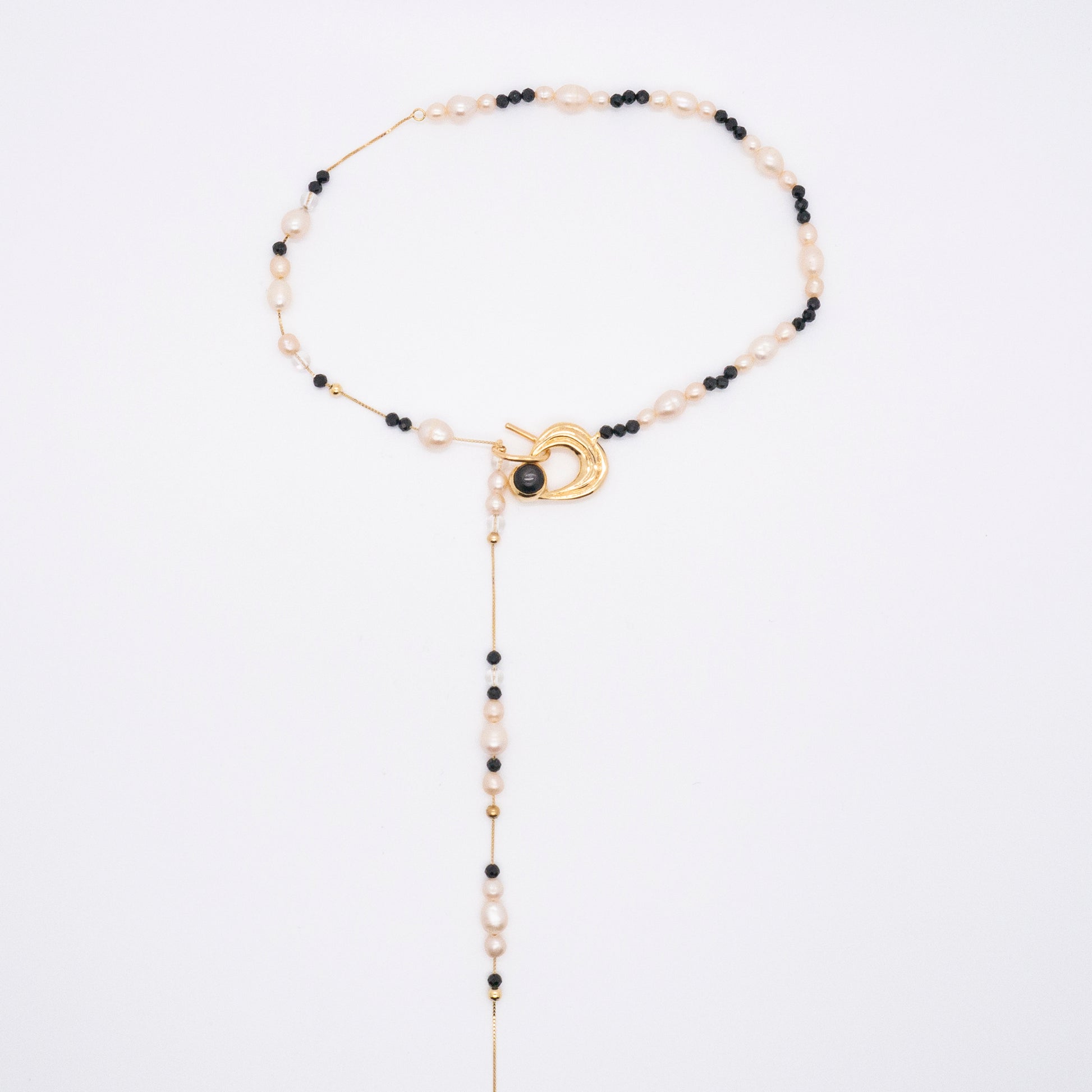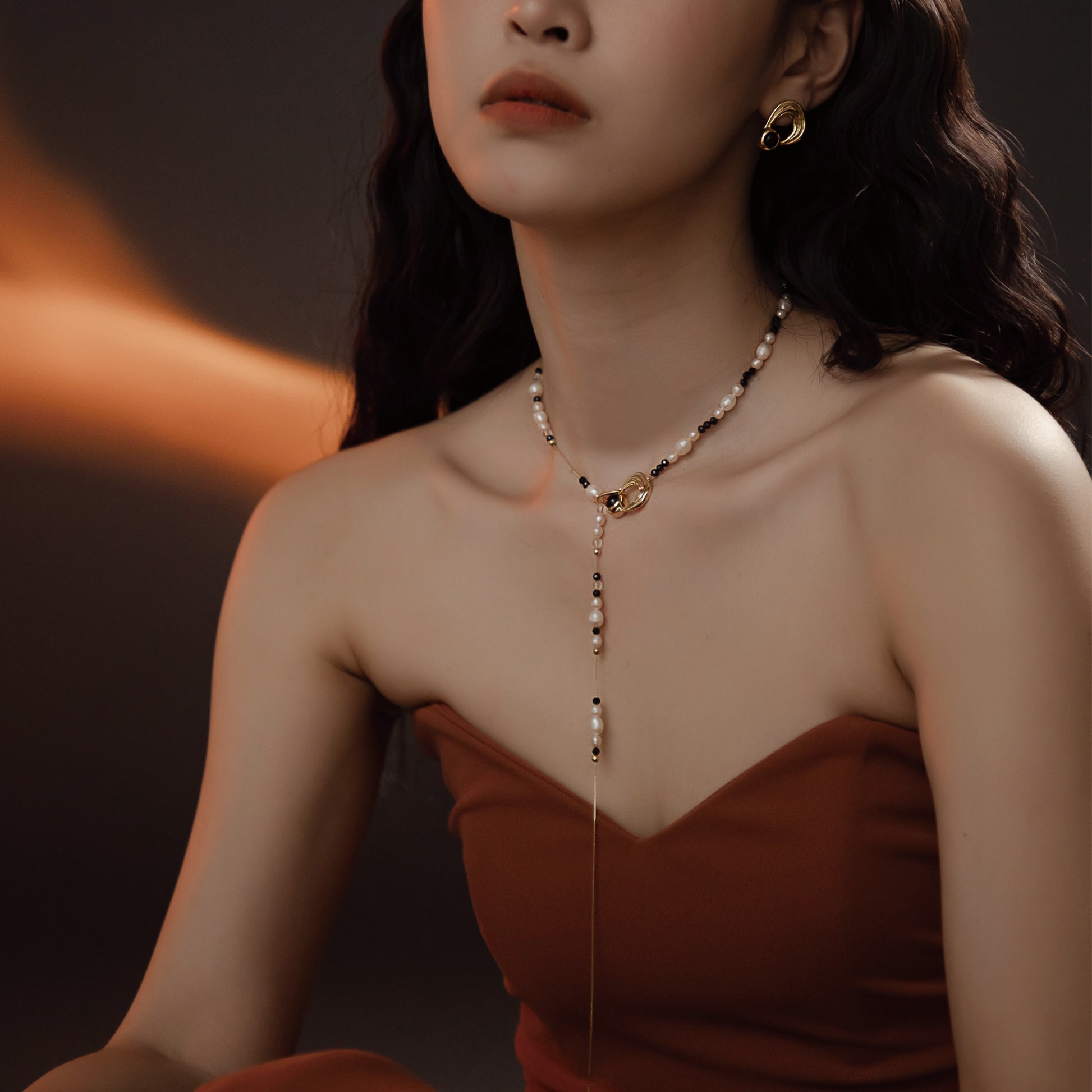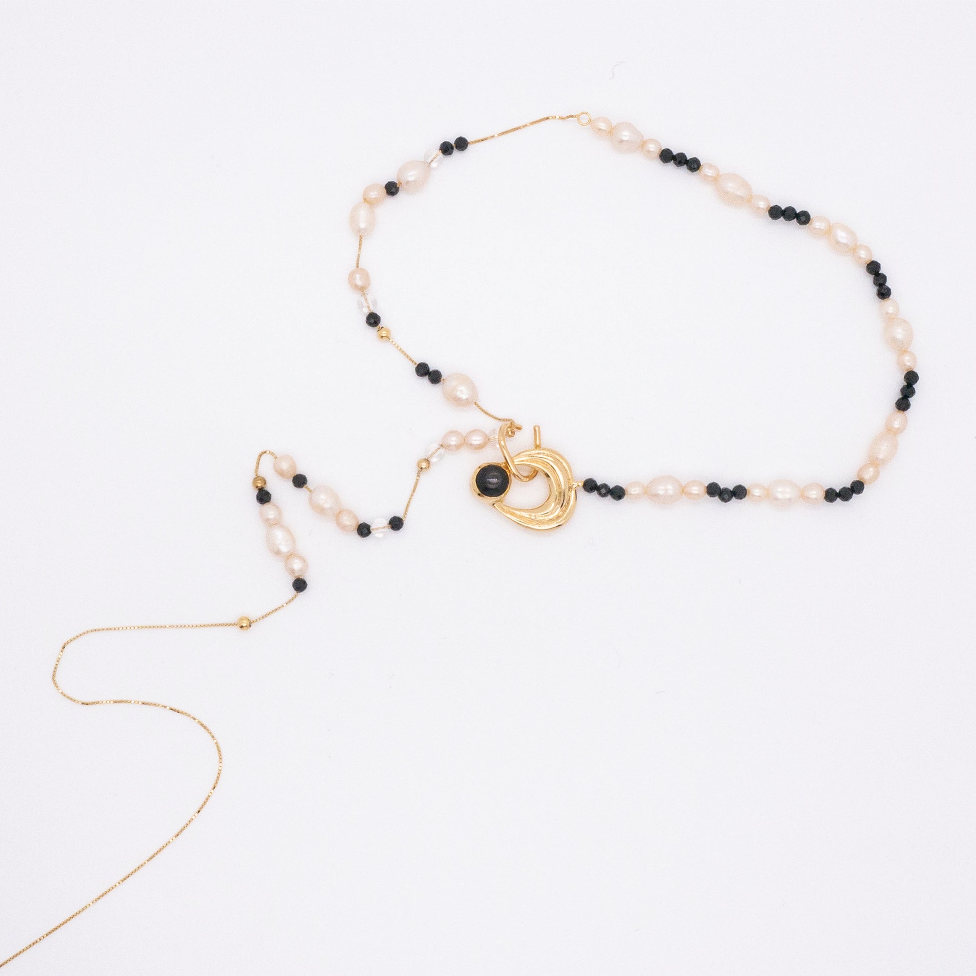 - 材質:純銀鏈厚鍍18K金、黃銅厚鍍18K金、金運石、黑尖晶石、天然淡水珠、白水晶