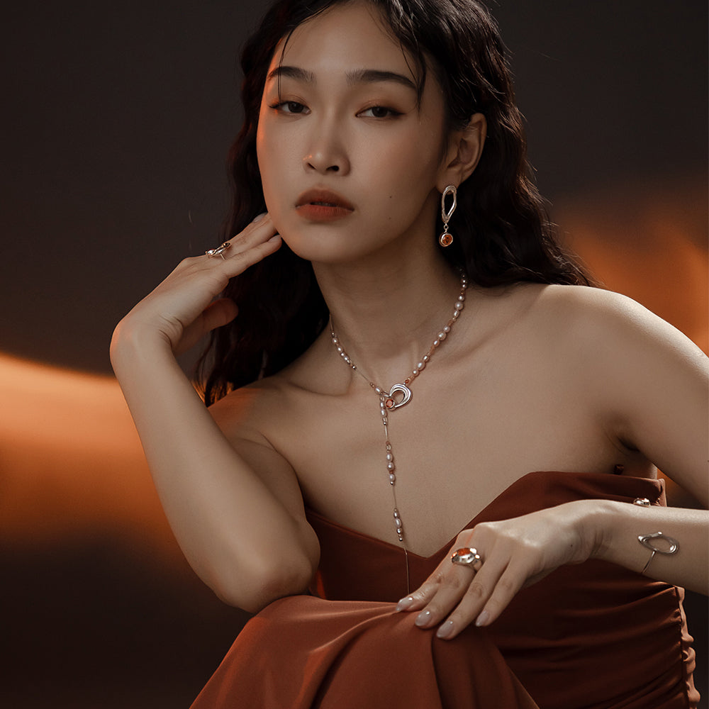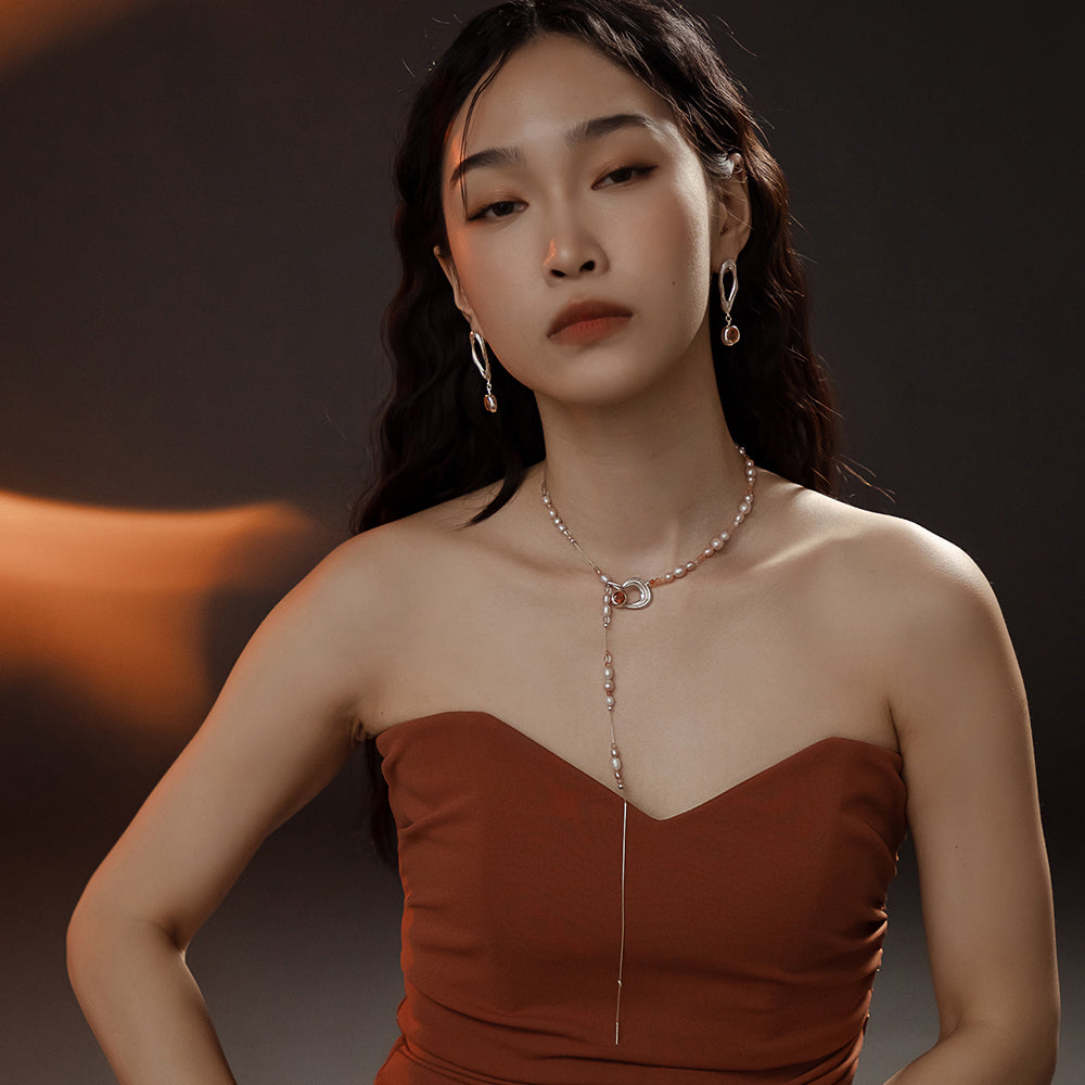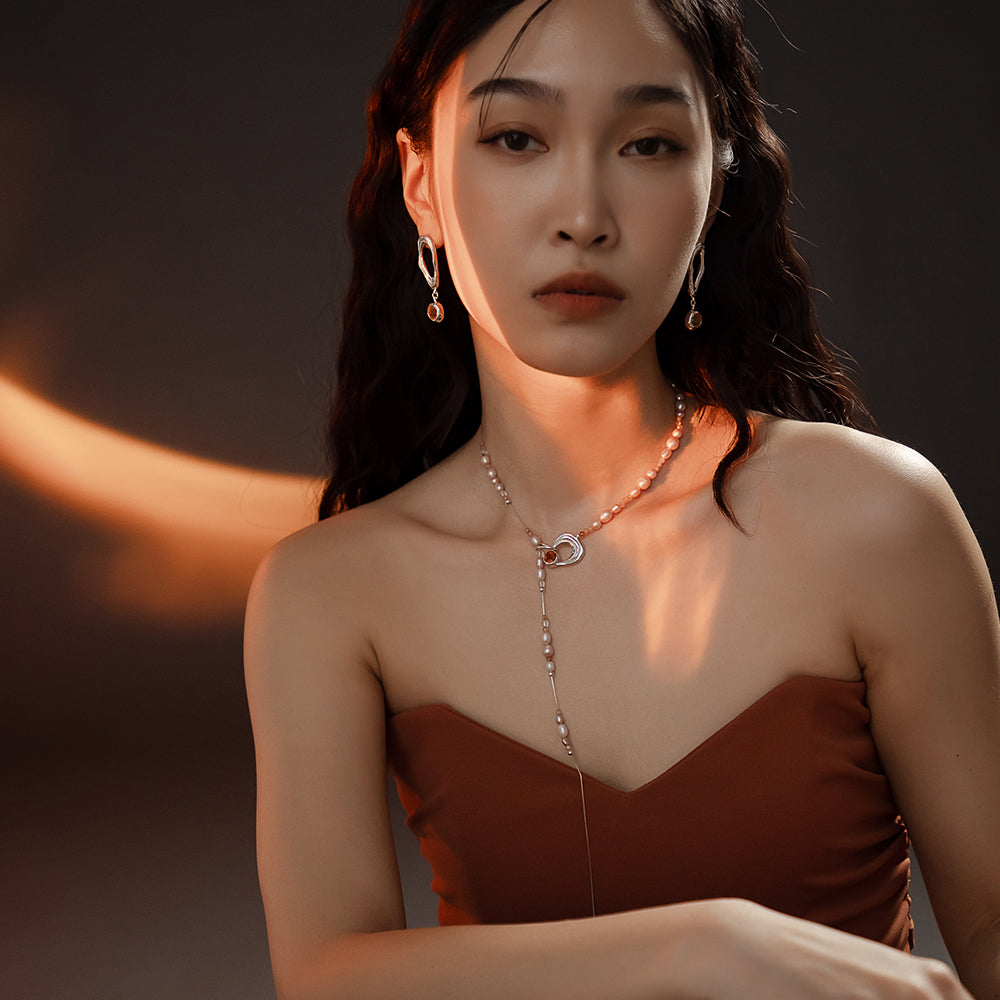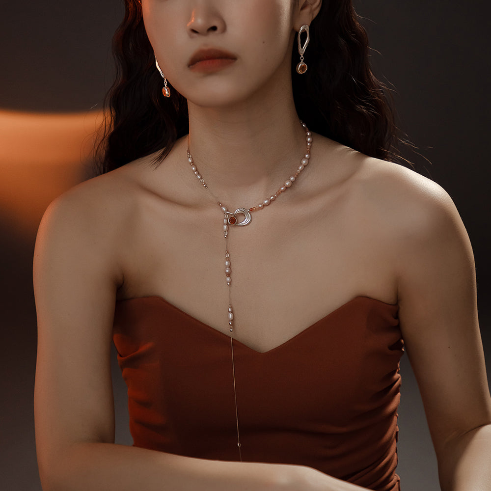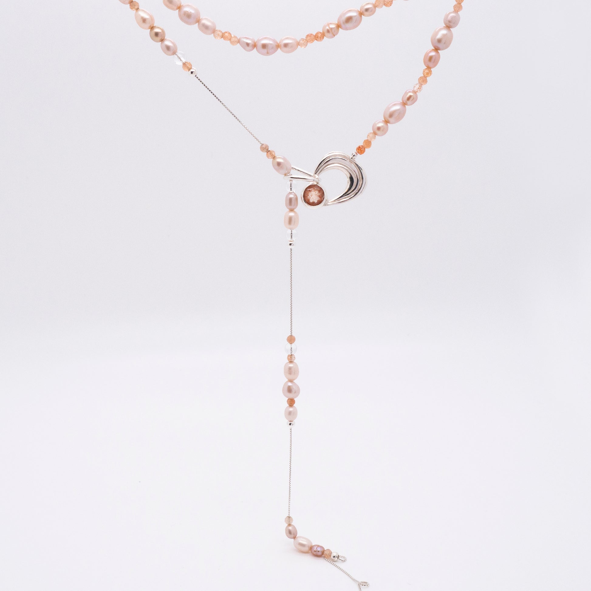 太陽閃焰系列 日珥太陽石粉色珍珠長鍊-純銀