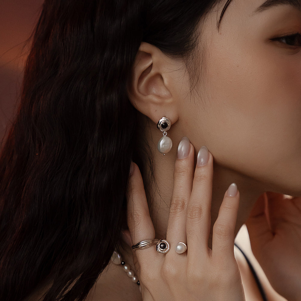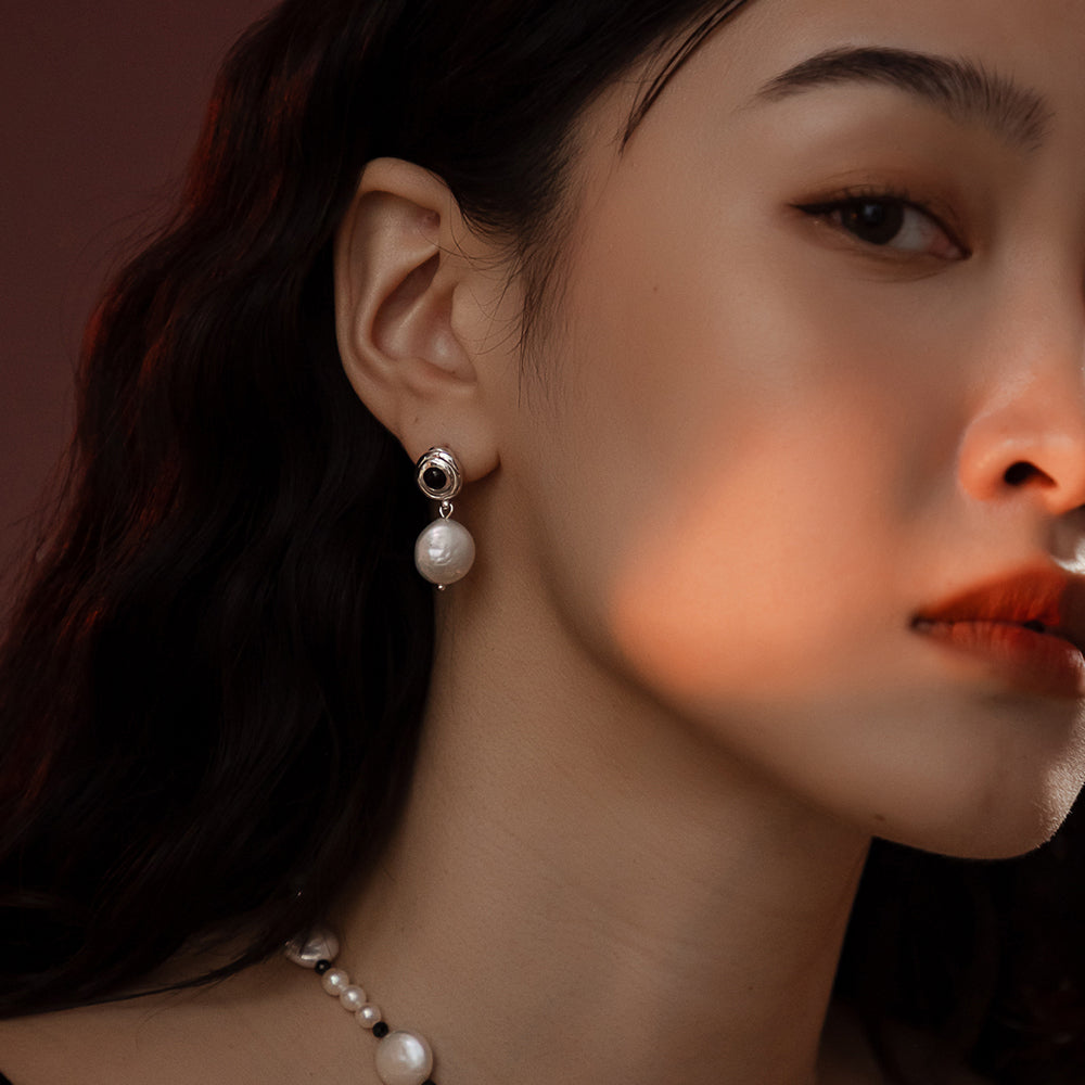 太陽閃焰系列 太陽黑子黑瑪瑙垂墜白珍珠耳環-純銀 (S)
