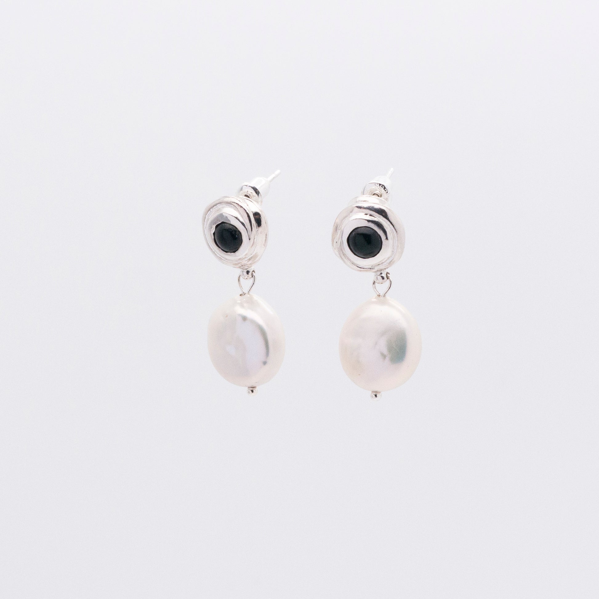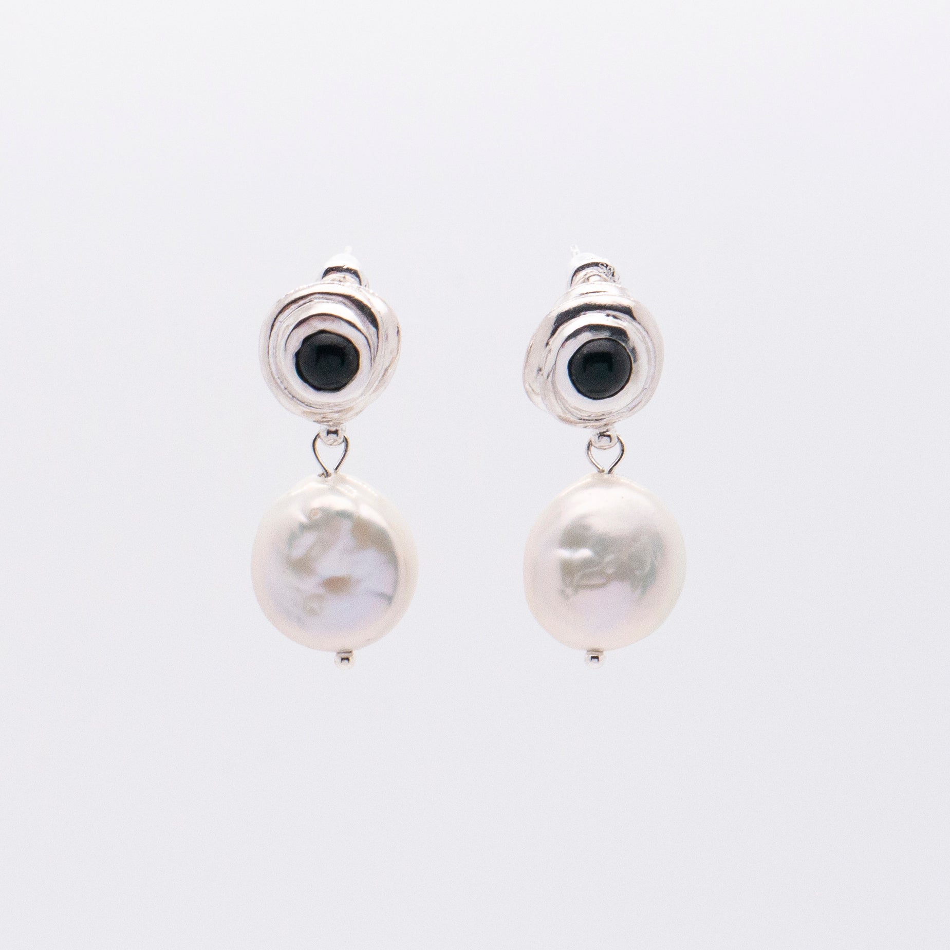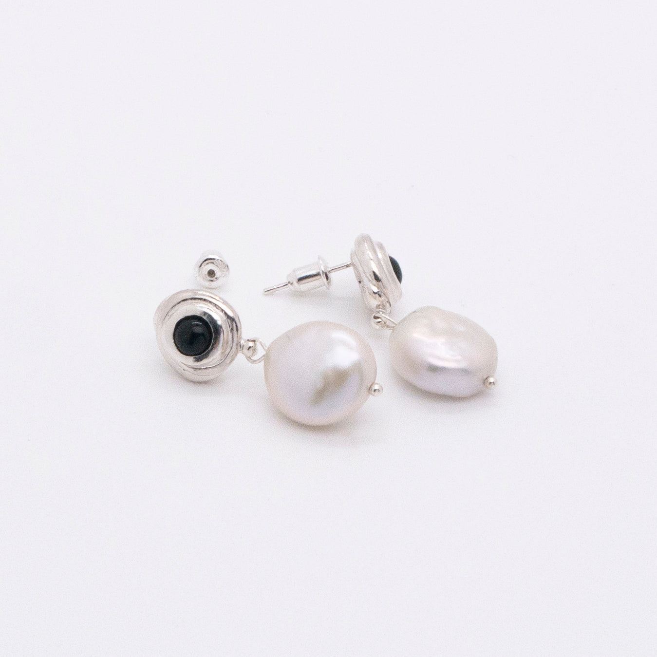太陽閃焰 太陽黑子黑瑪瑙垂墜白珍珠耳環-純銀 (S)
