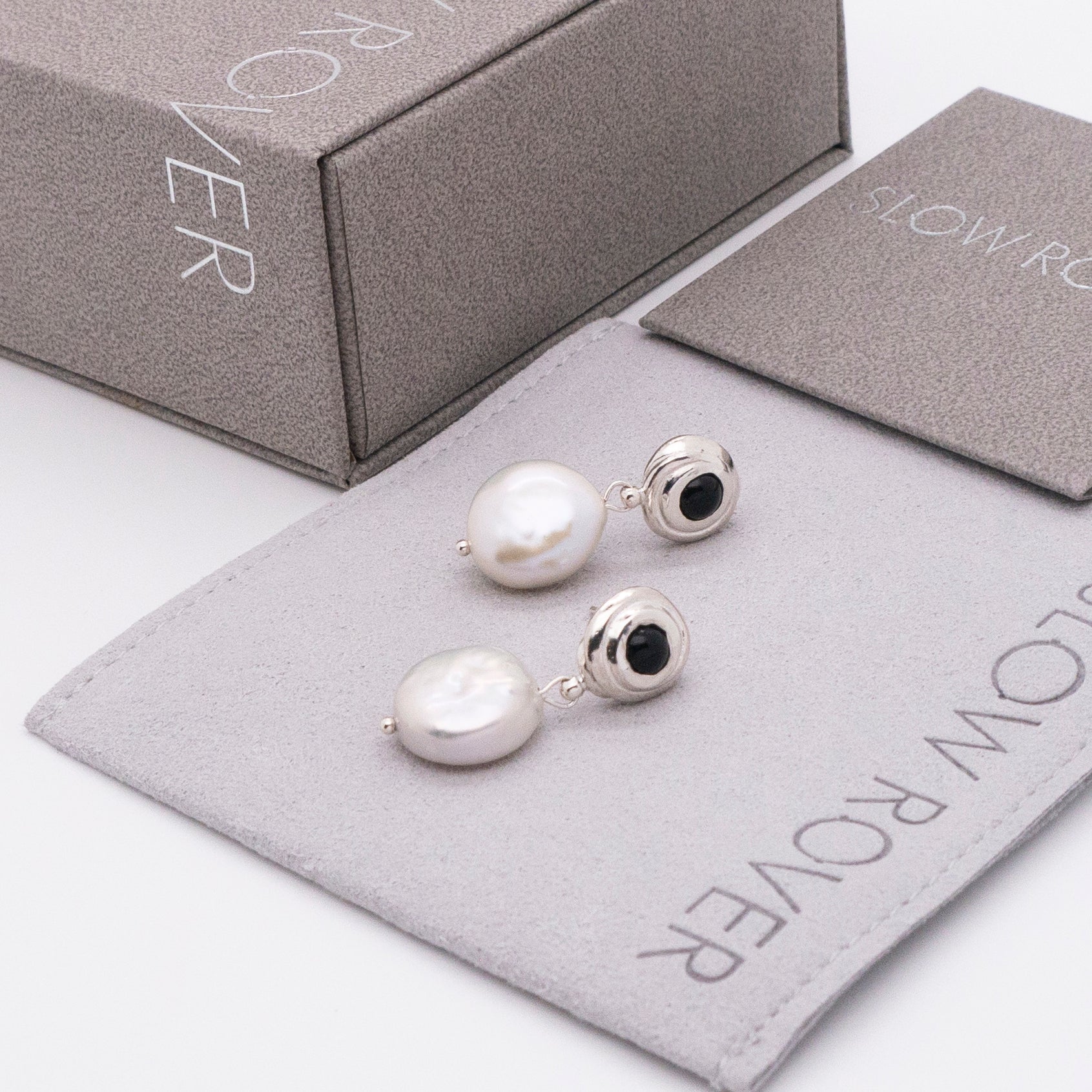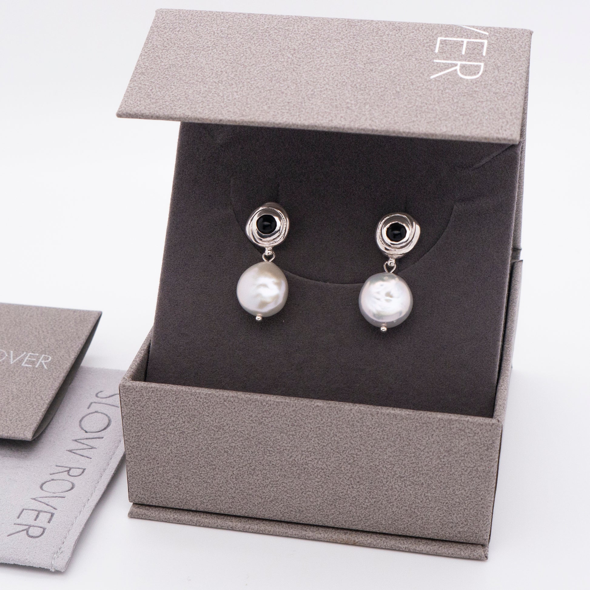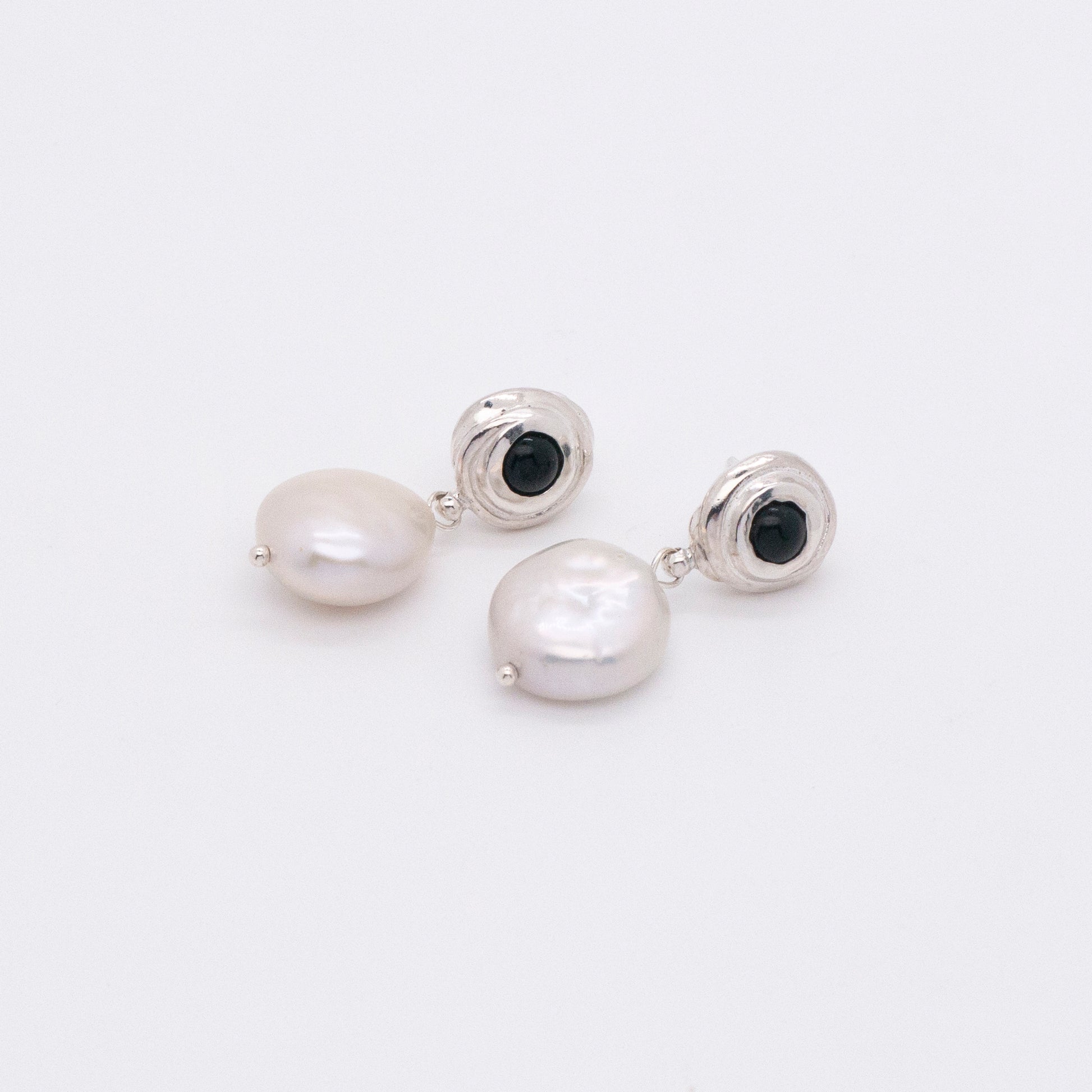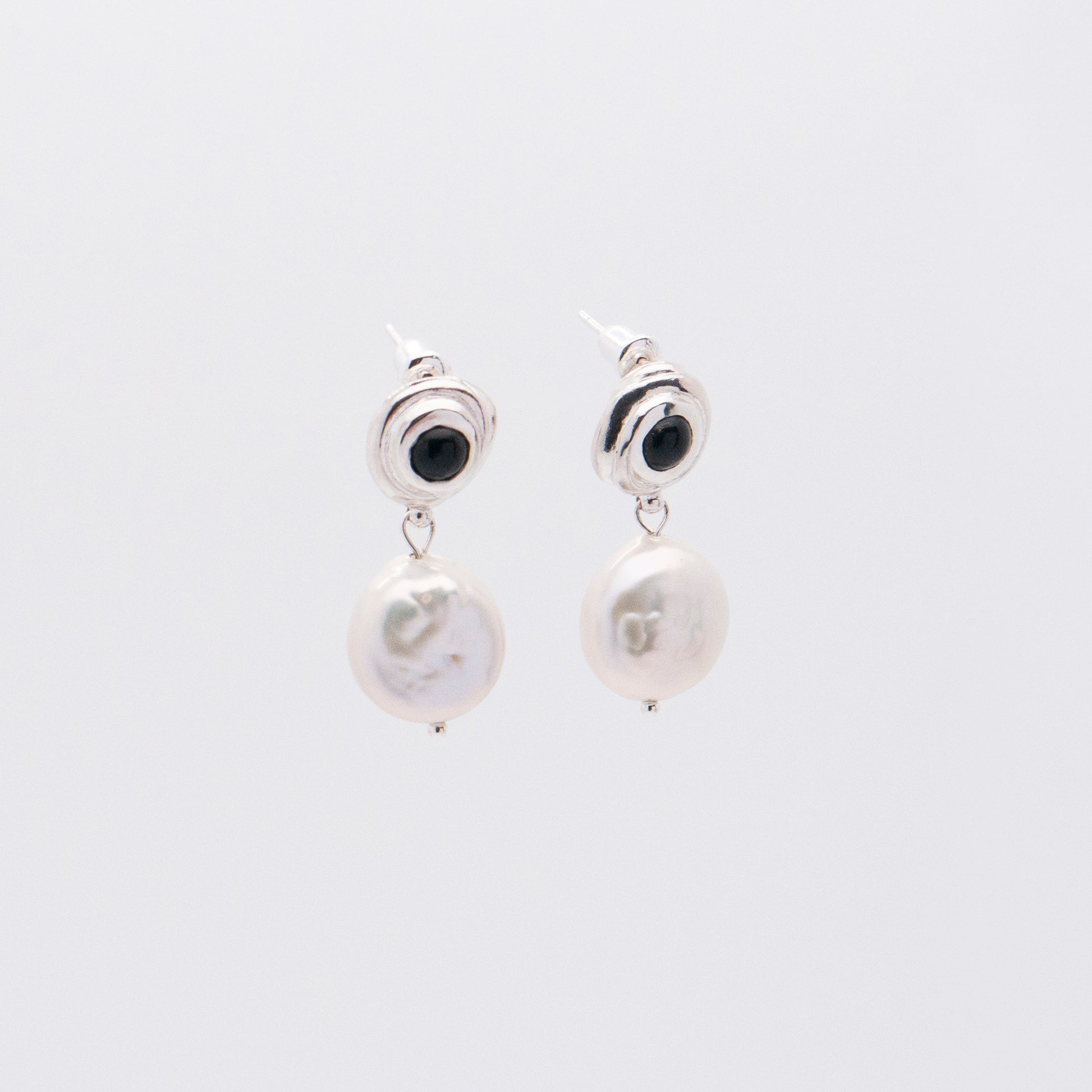 太陽閃焰 太陽黑子黑瑪瑙垂墜白珍珠耳環-純銀 (S)