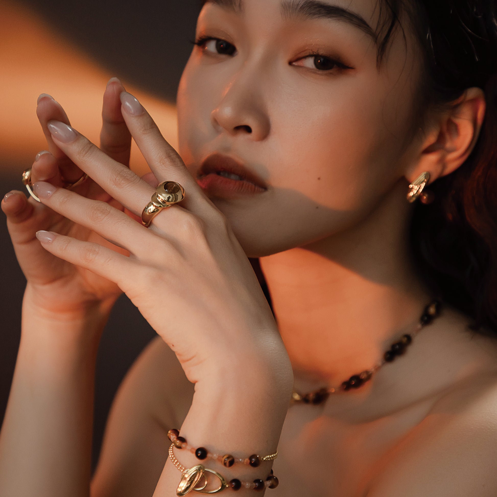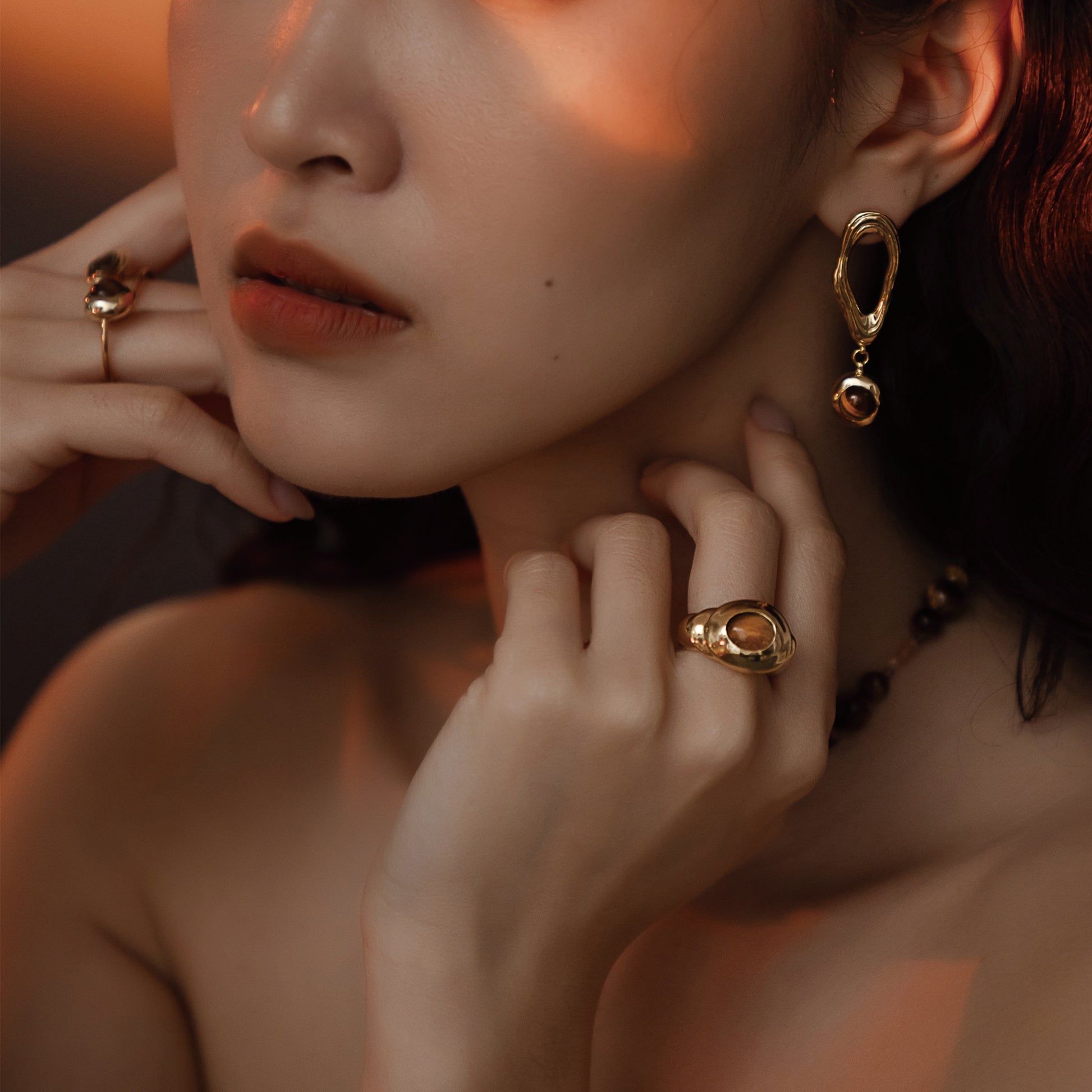 太陽閃焰系列 太陽黑子虎眼石戒指/耳夾-厚鍍18K金