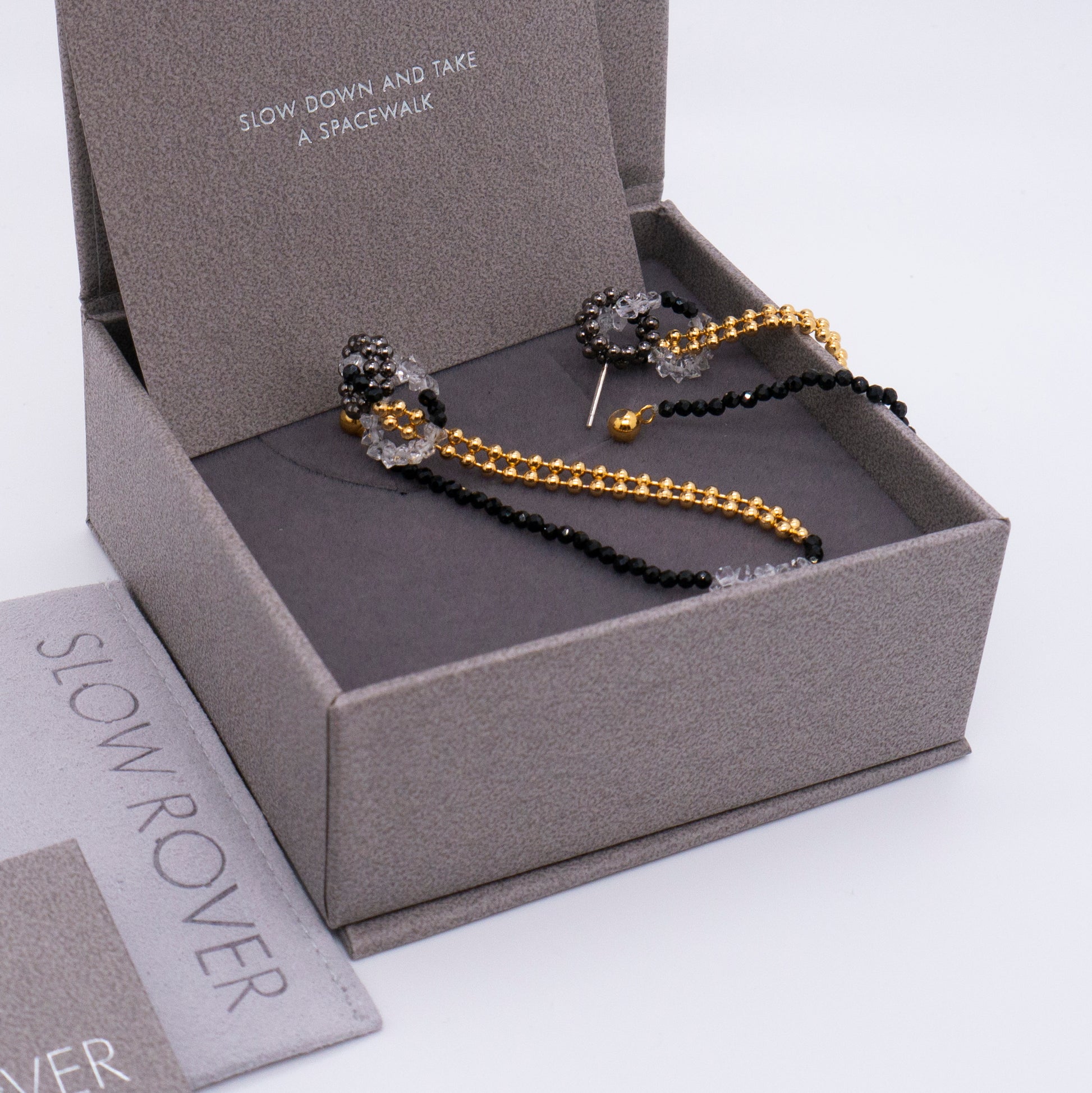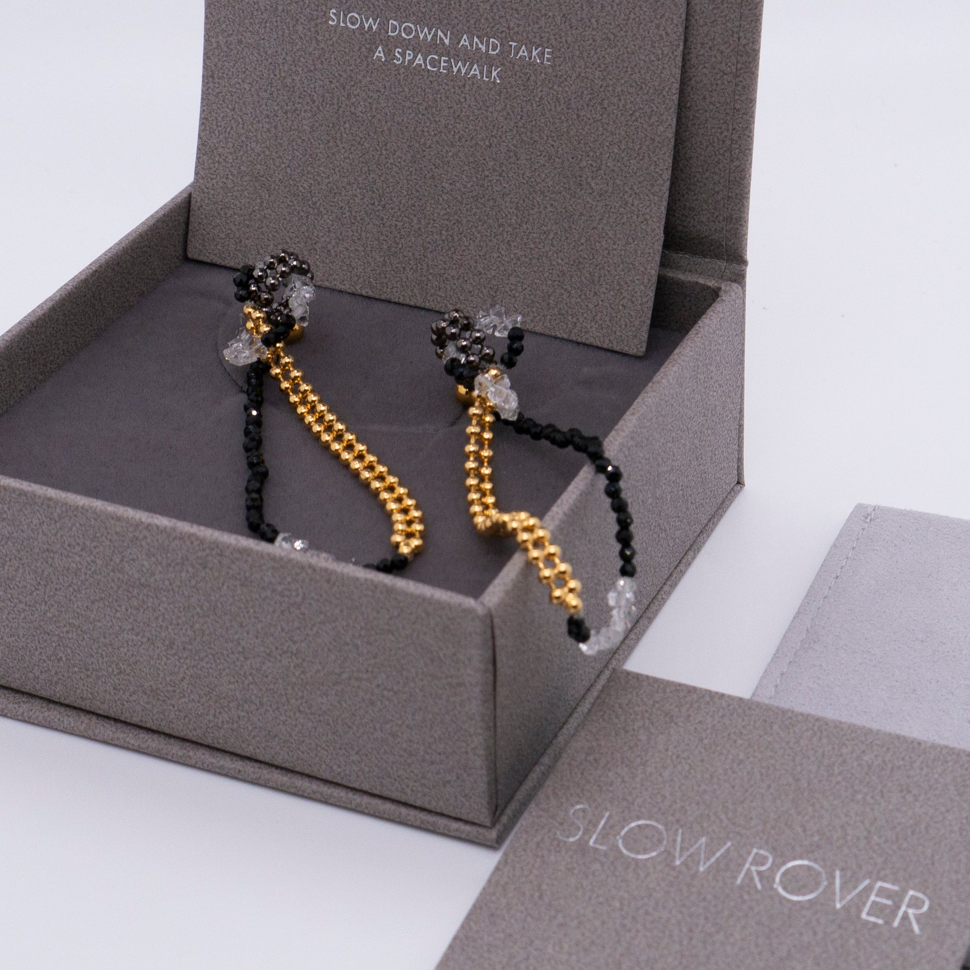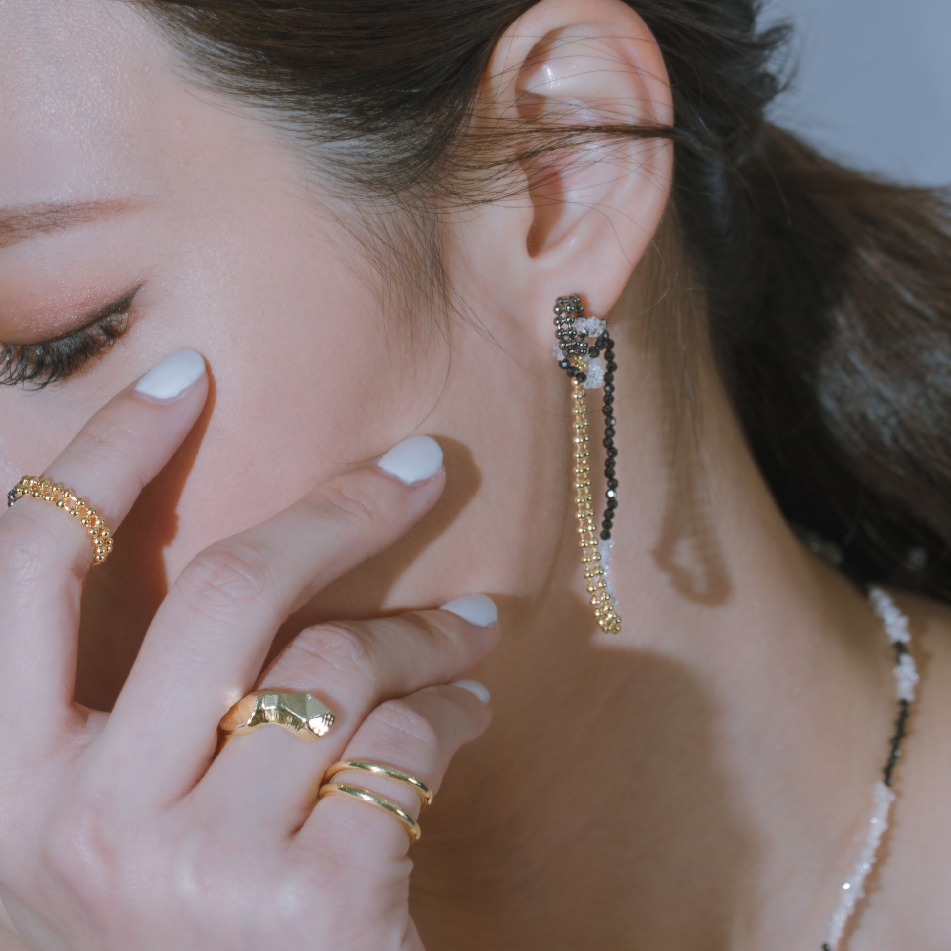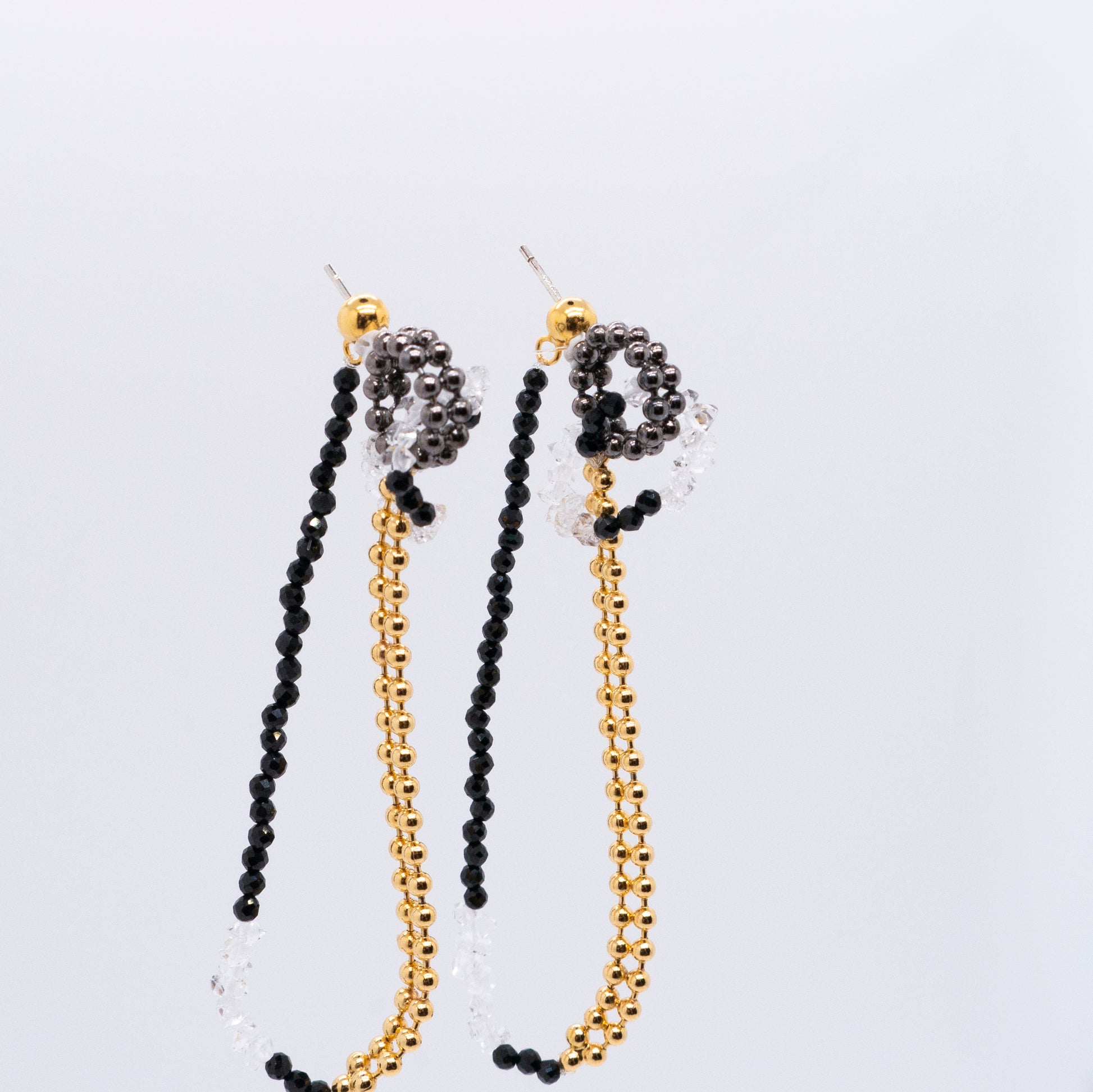 - 材質:黃銅厚鍍黑金&18K金、閃靈鑽(赫基蒙水晶)、黑尖晶石、925純銀耳針與後扣